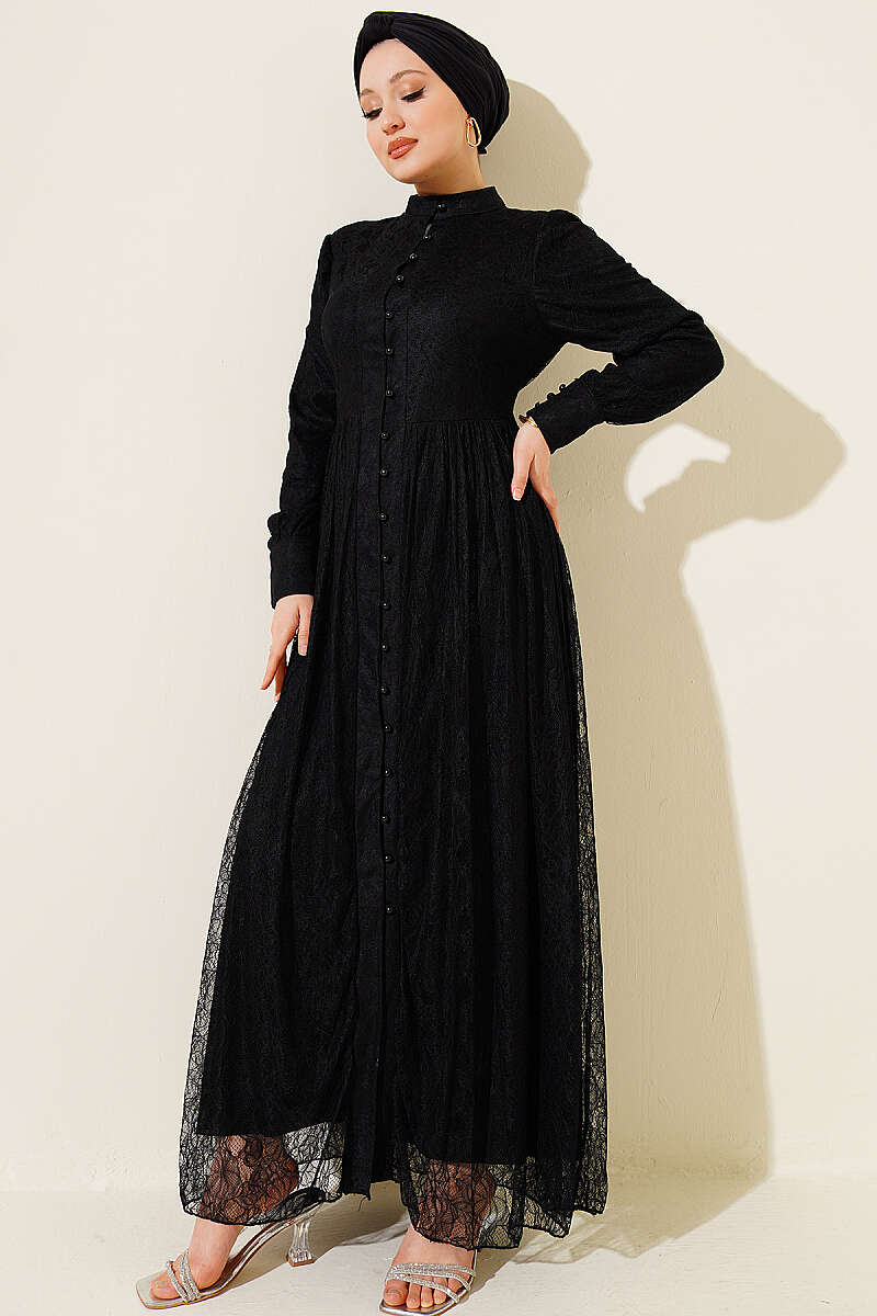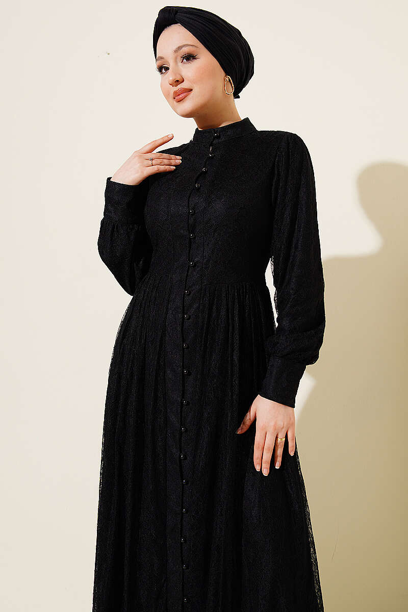 Yarım Düğmeli Dantel Detaylı Elbise Siyah