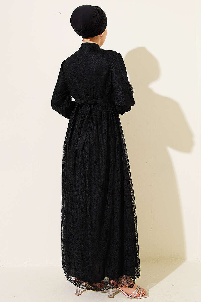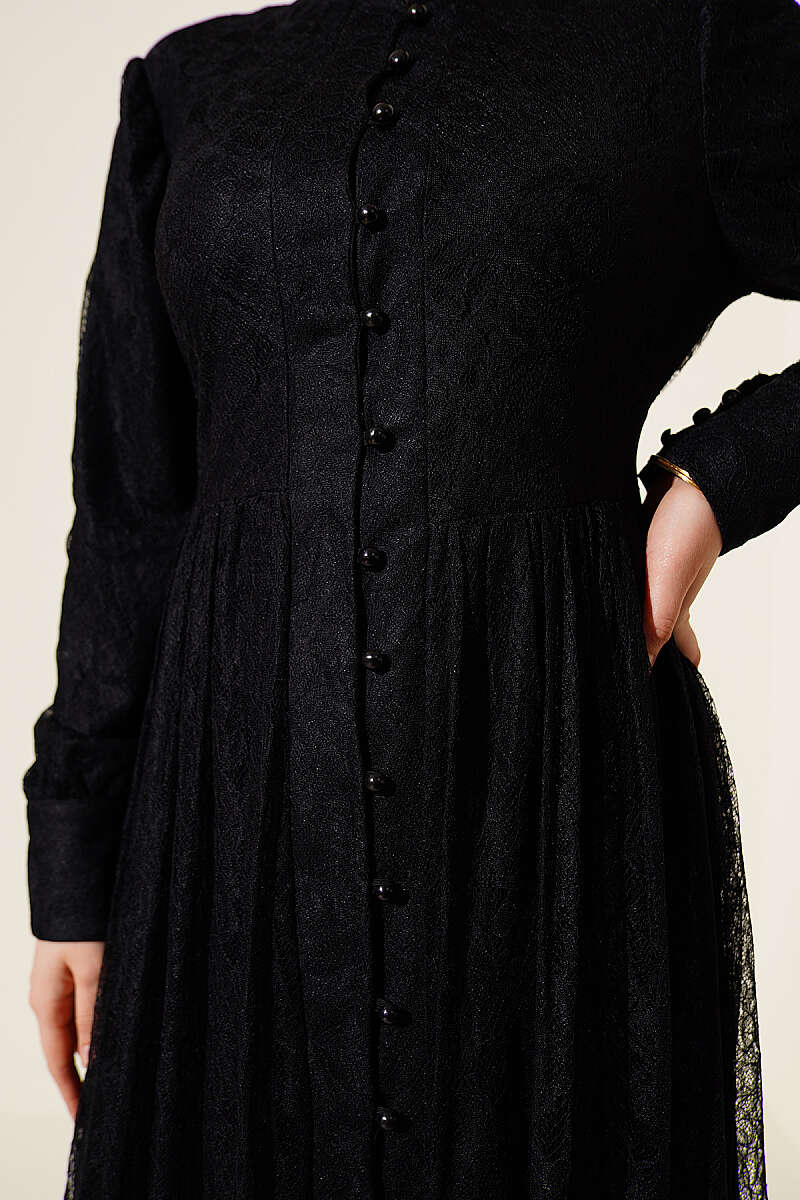 Brit Düğmeli Dantelli Abiye Elbise Siyah