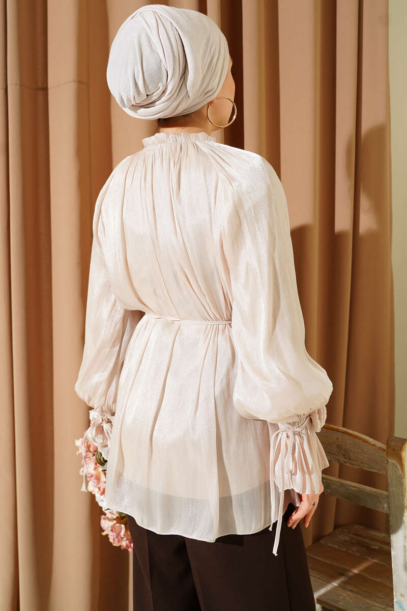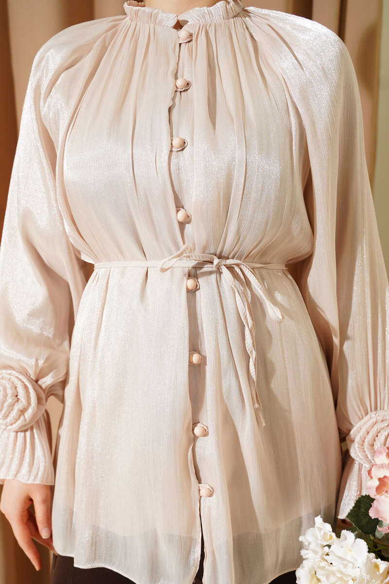 Brit Düğmeli Gül Detaylı Abiye Gömlek Pudra