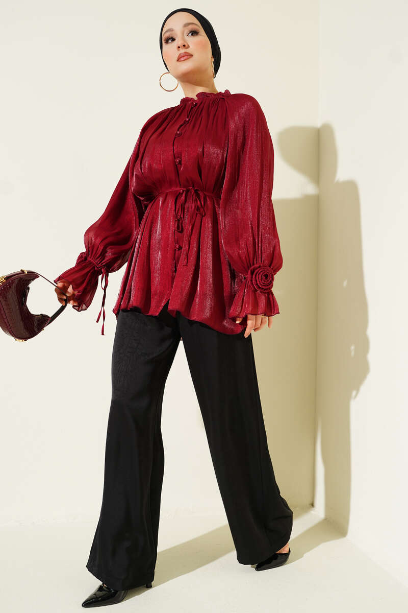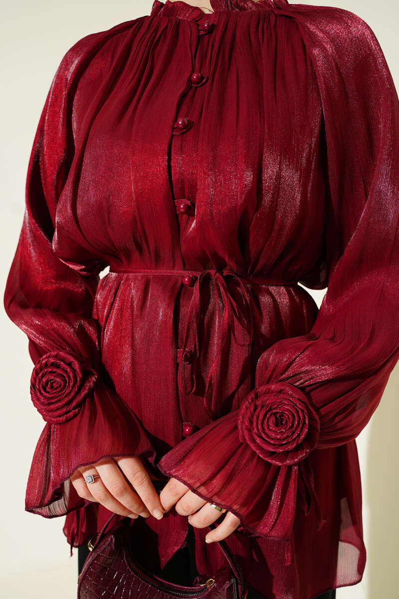 Brit Düğmeli Gül Detaylı Abiye Gömlek Buz Mavisi