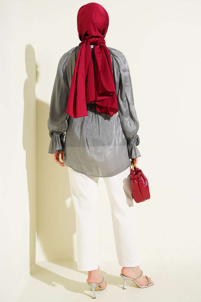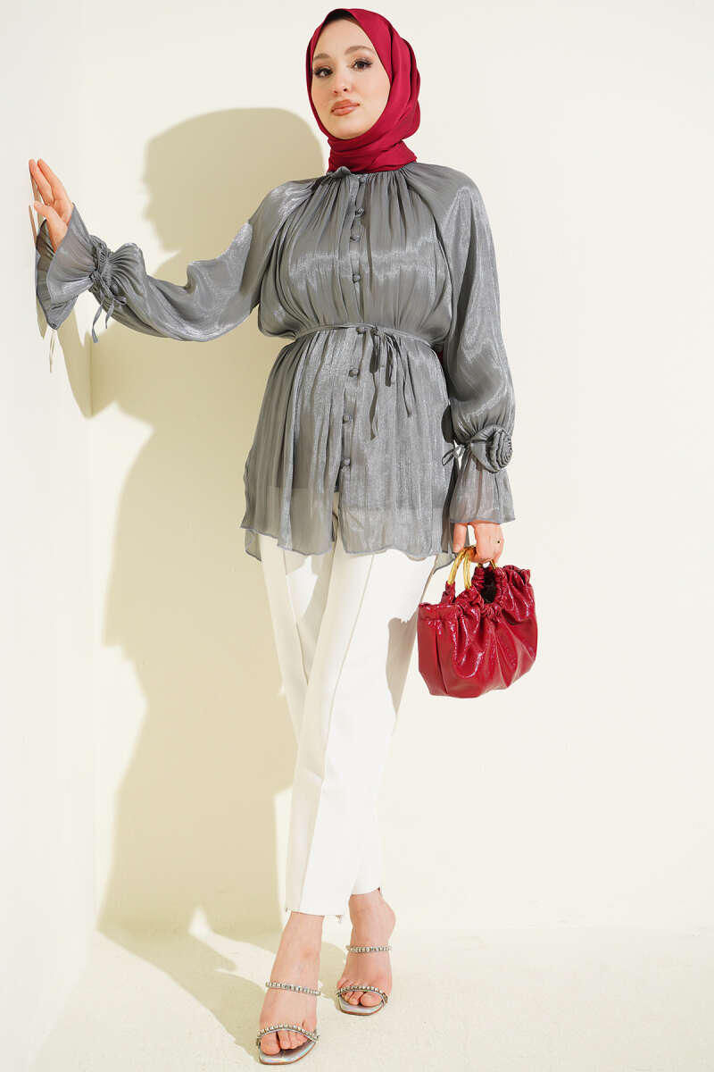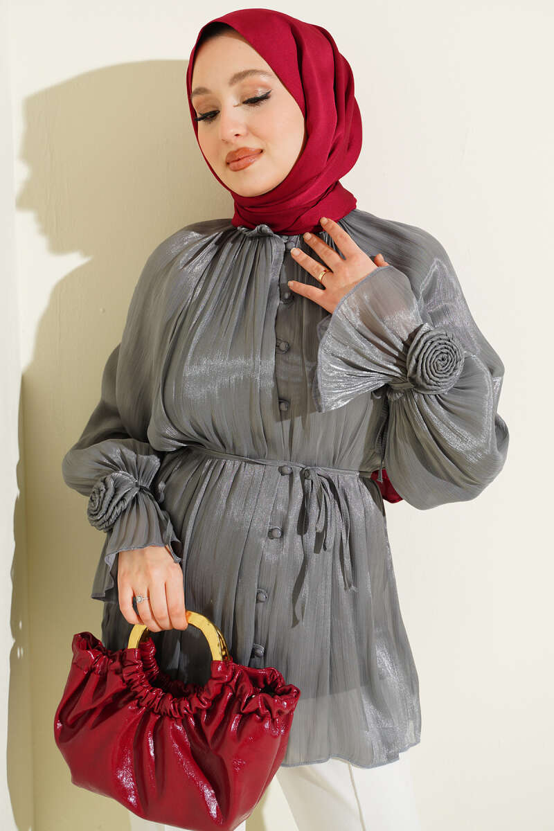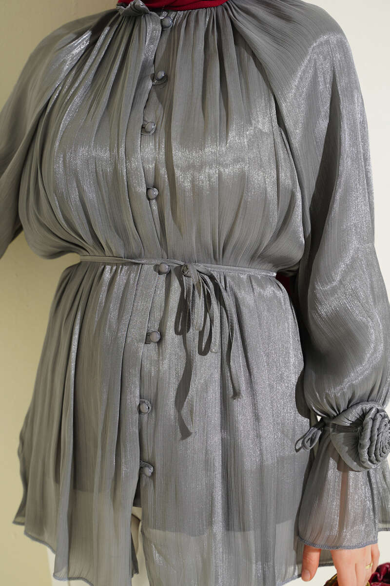 Brit Düğmeli Gül Detaylı Abiye Gömlek Buz Mavisi