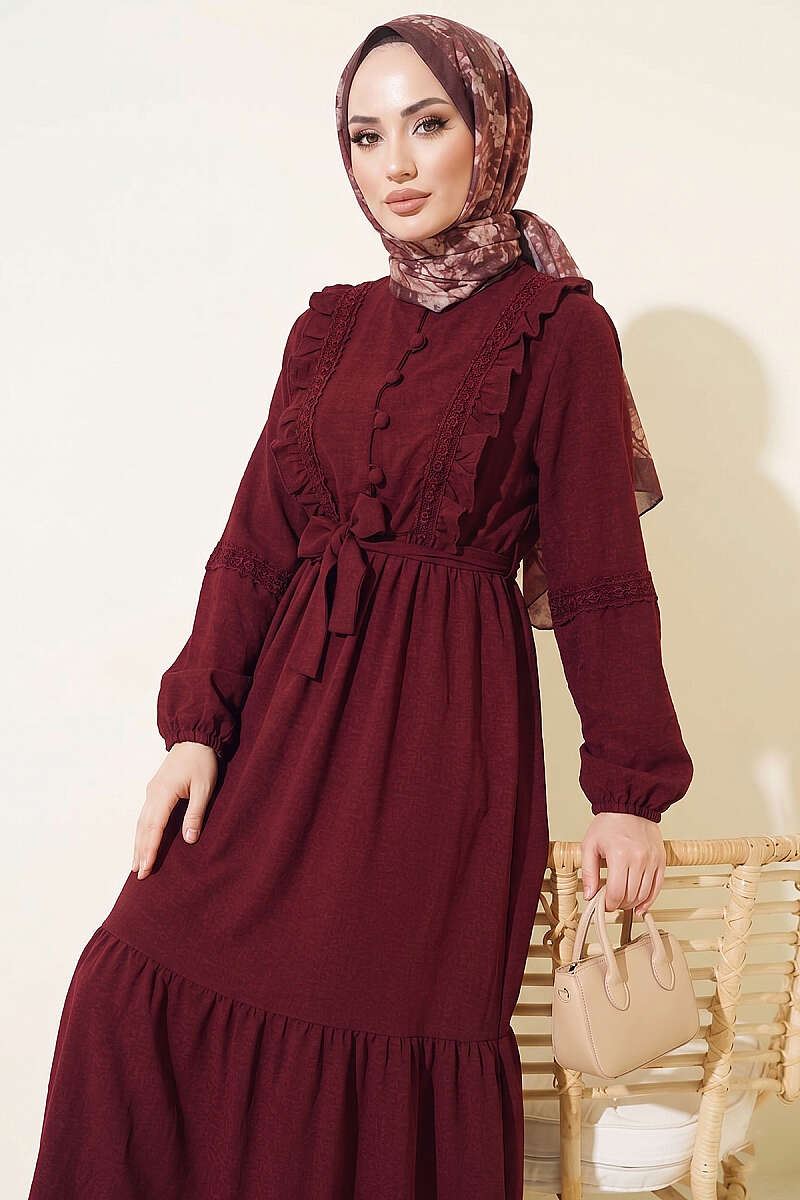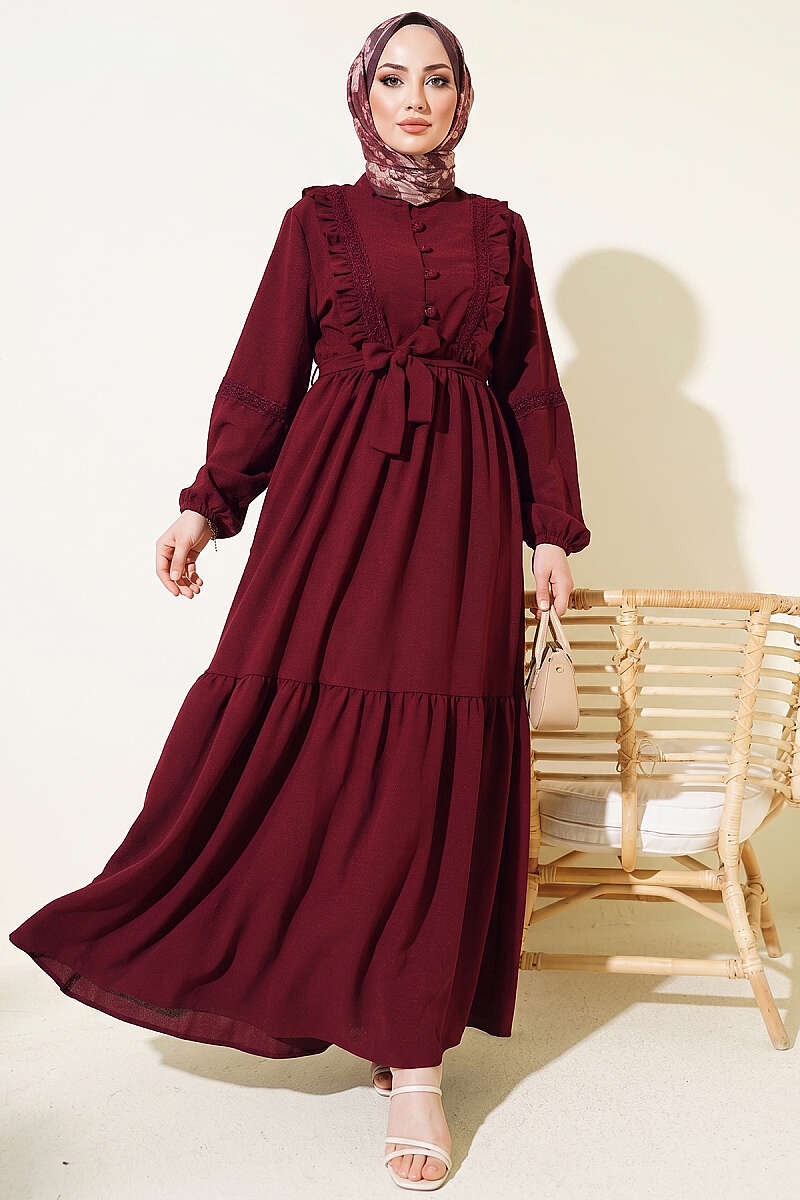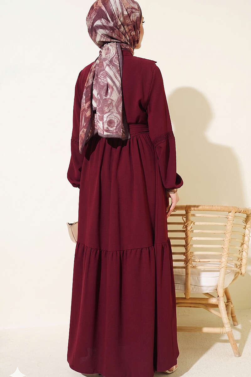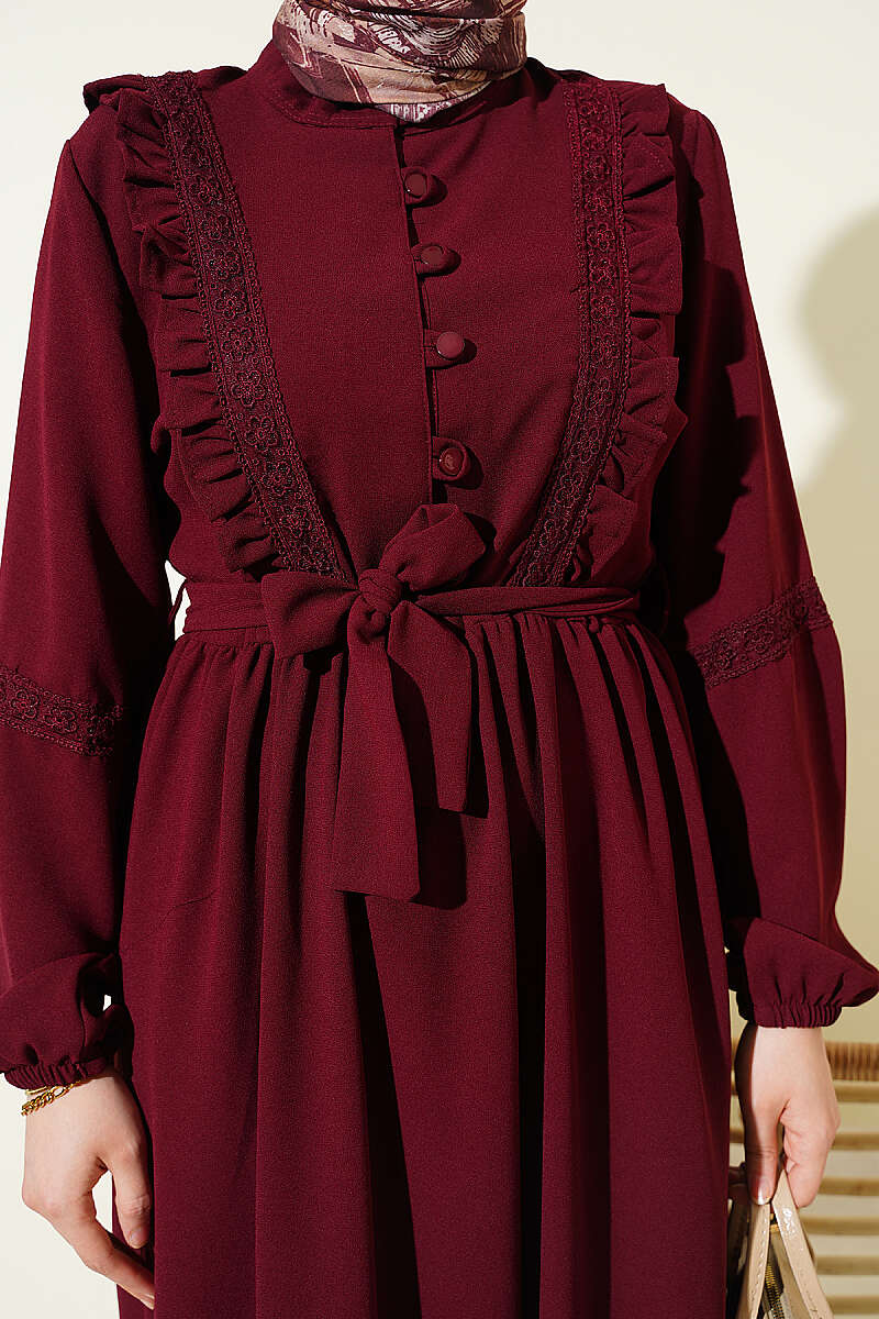 Brit Düğmeli Güpür Detaylı Elbise Bordo