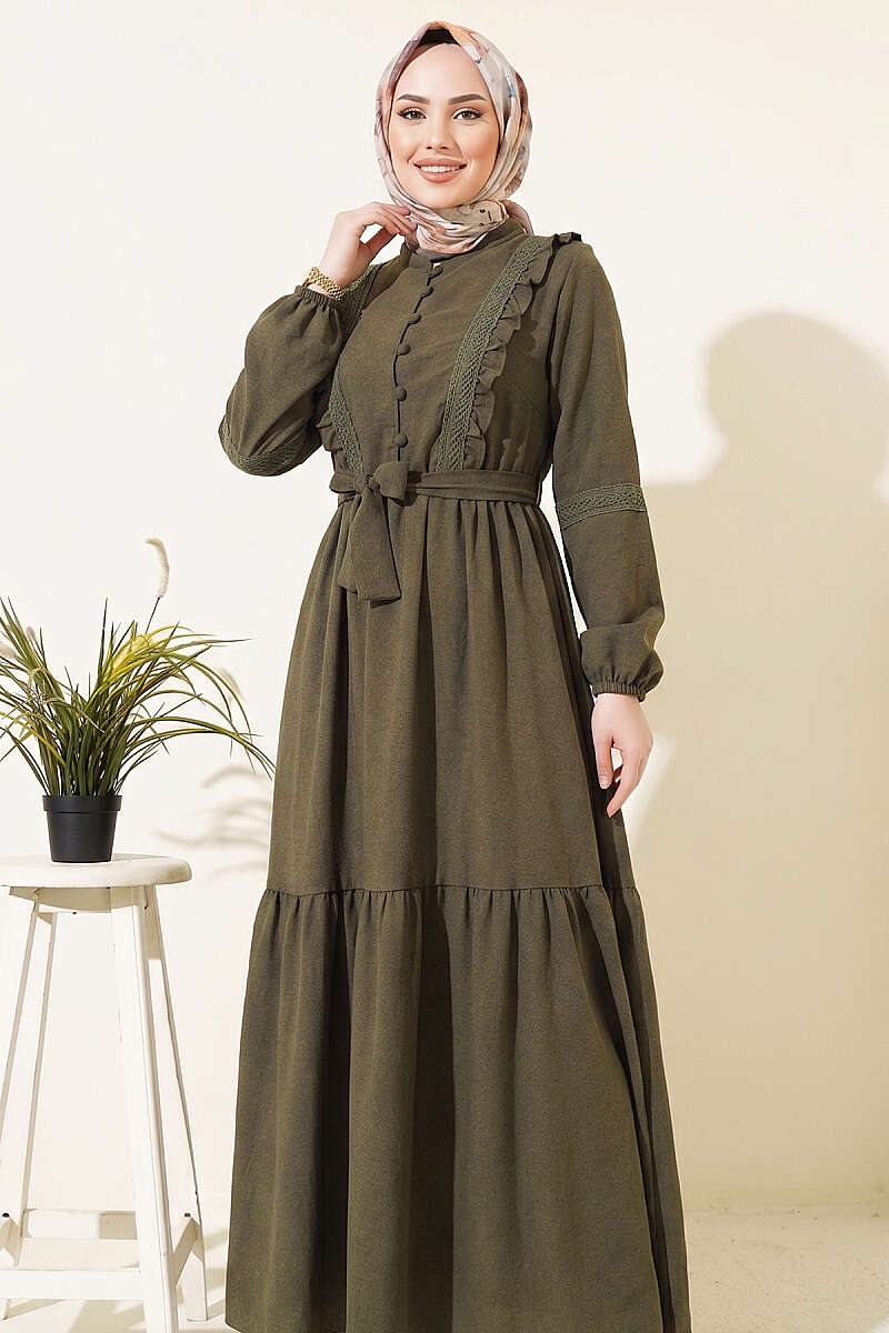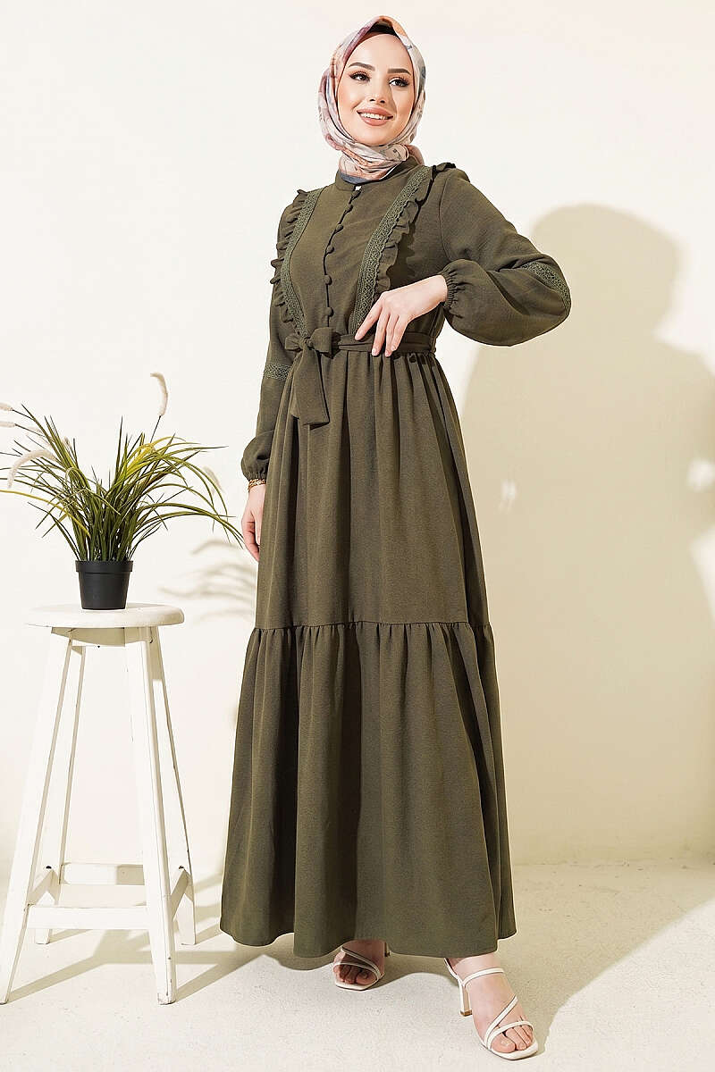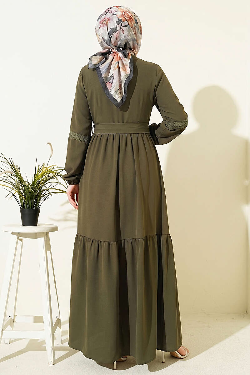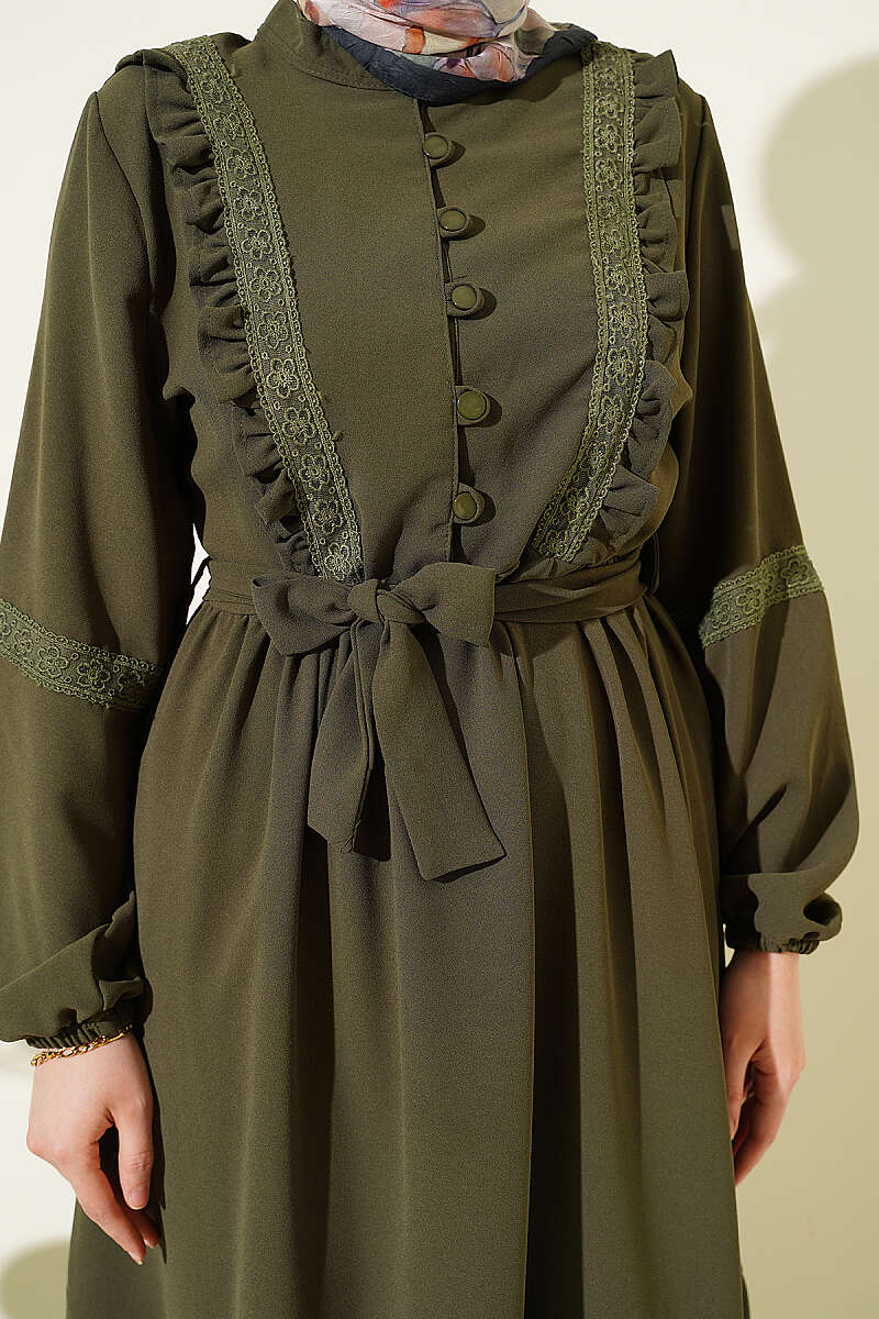 Brit Düğmeli Güpür Detaylı Elbise Haki