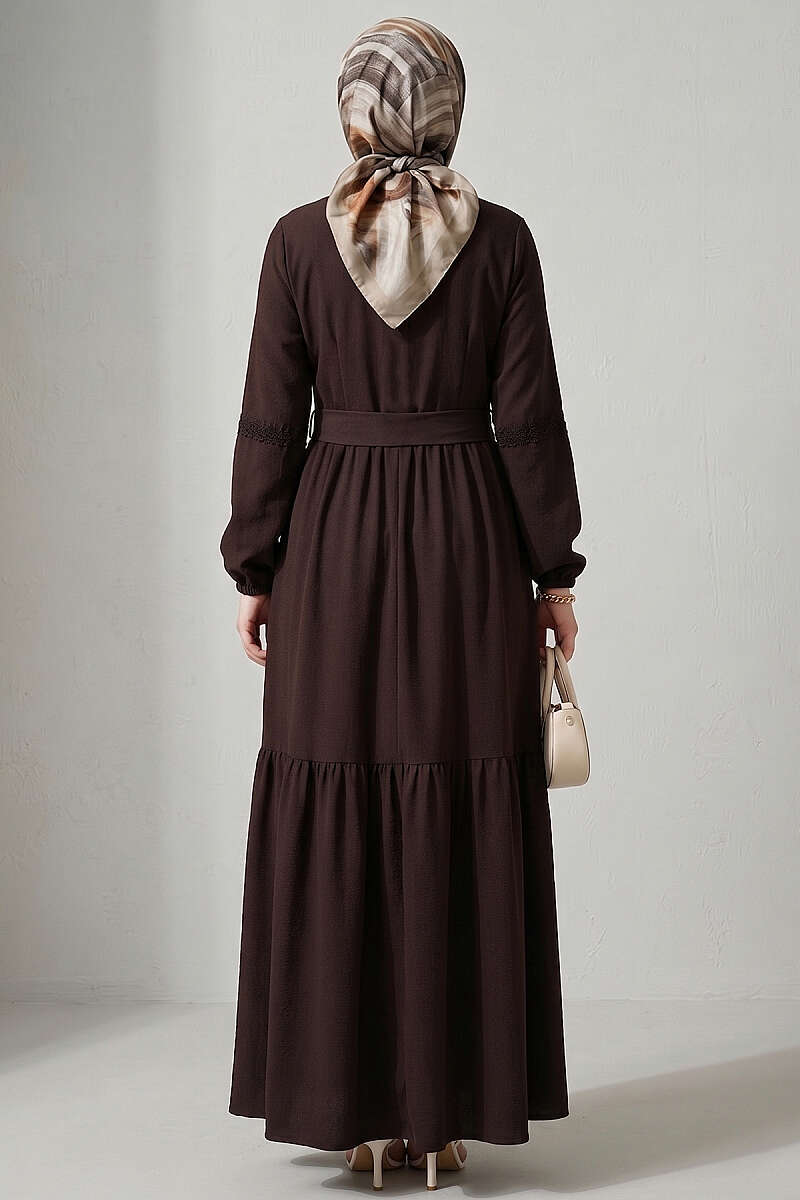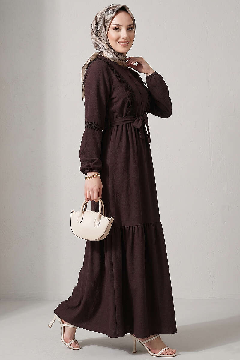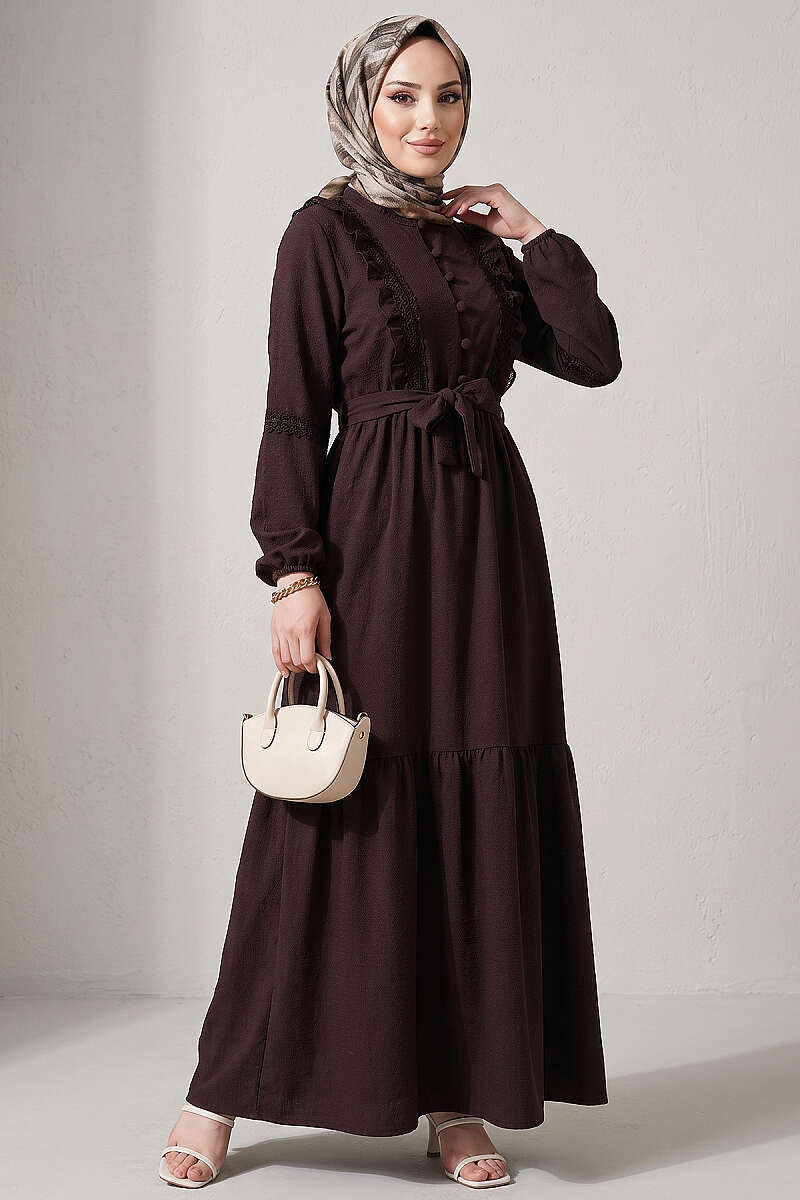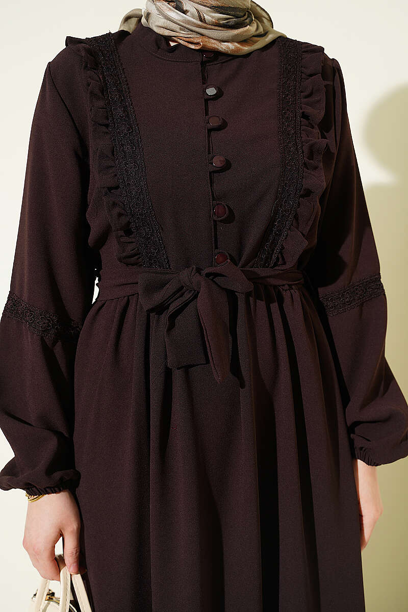 Brit Düğmeli Güpür Detaylı Elbise Kahve