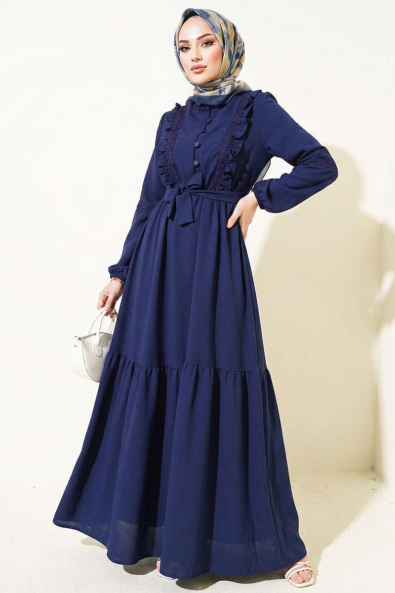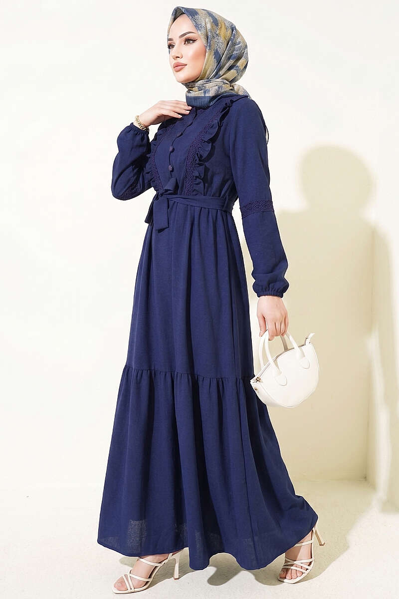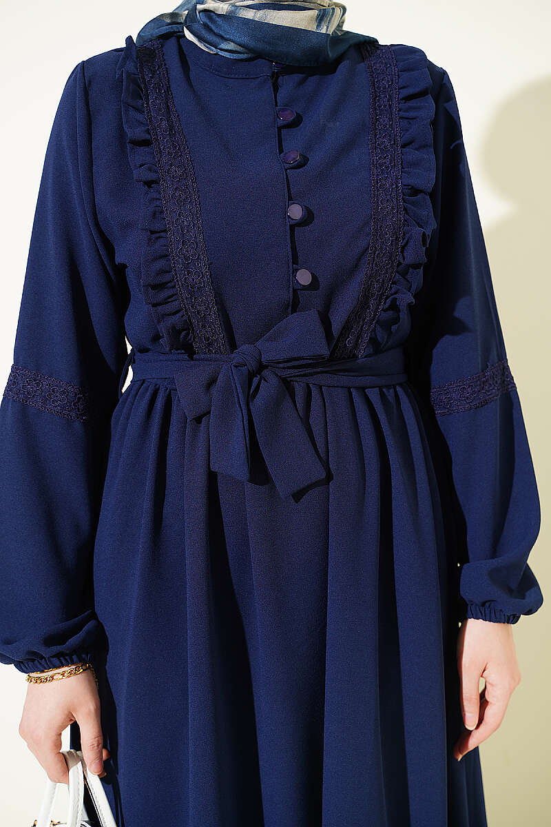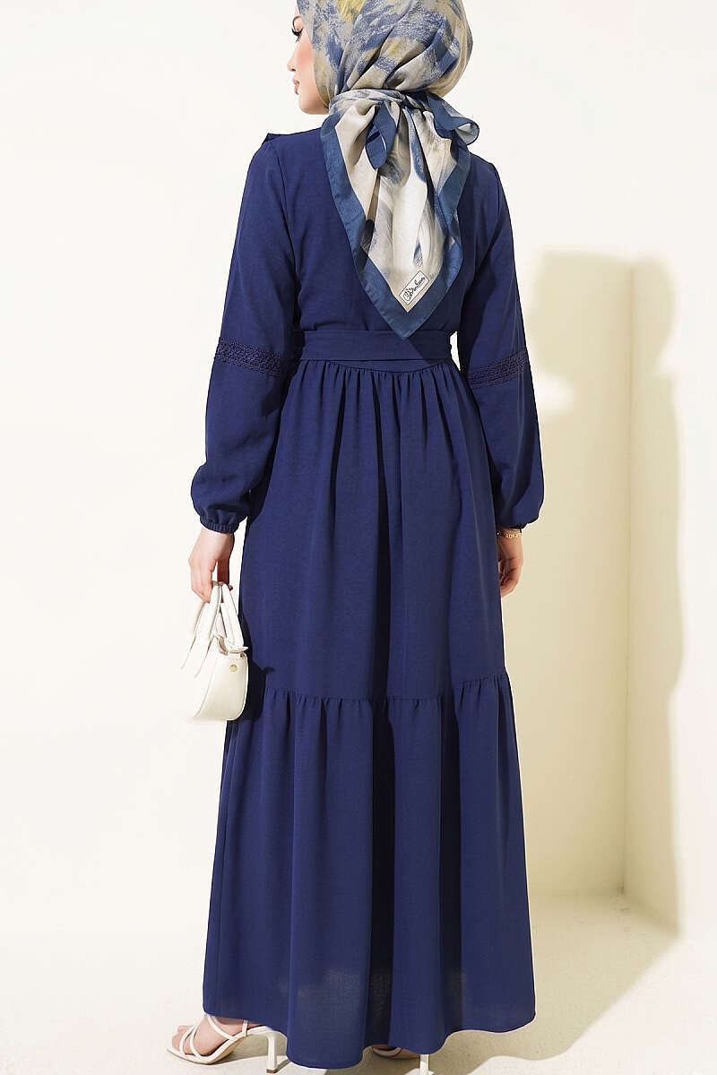 Brit Düğmeli Güpür Detaylı Elbise Lacivert