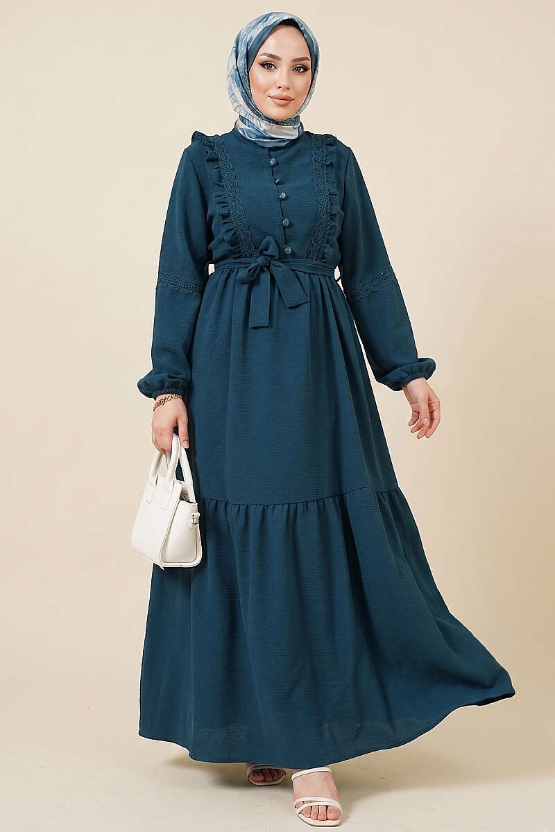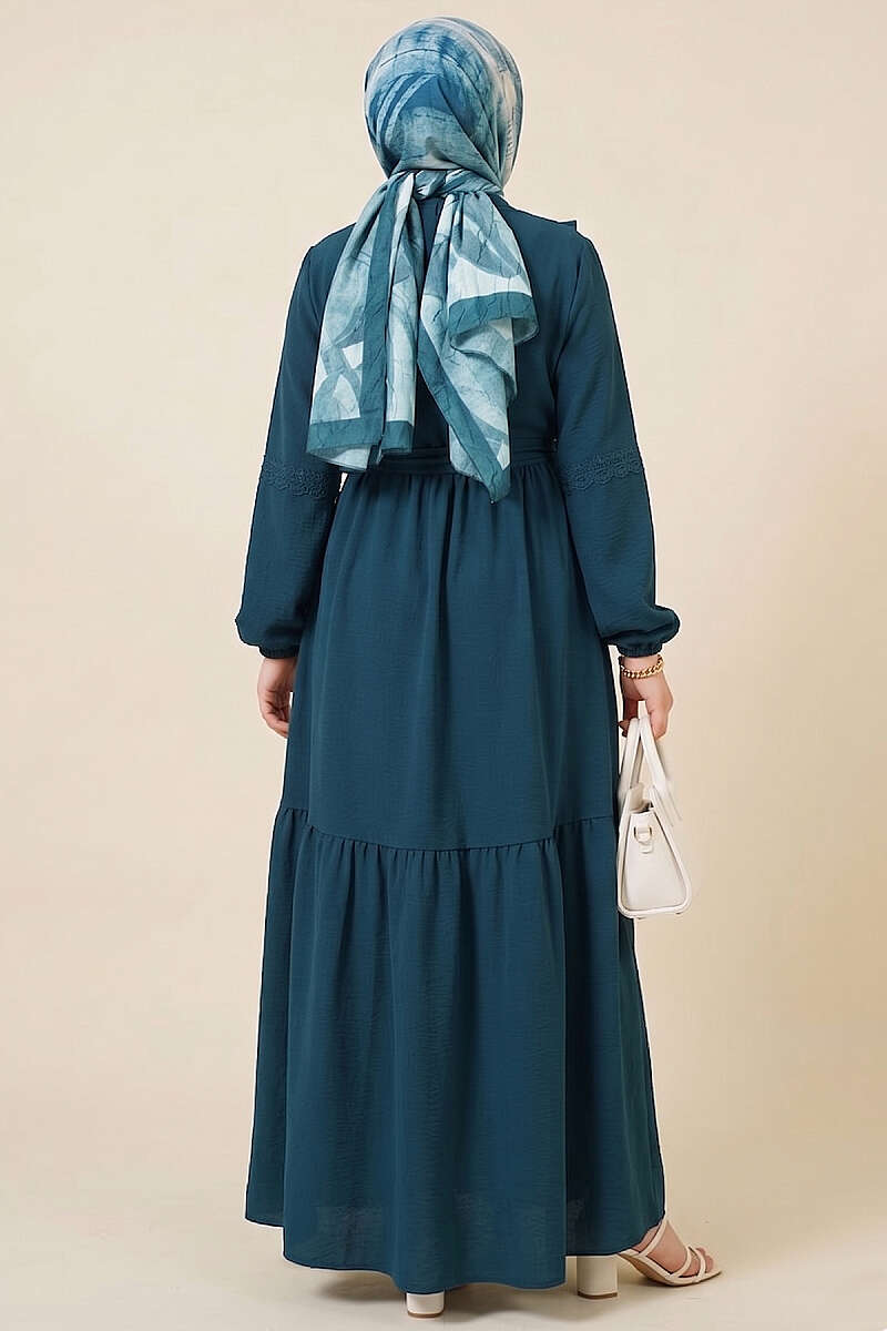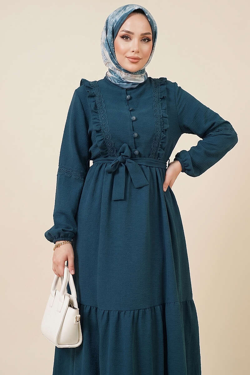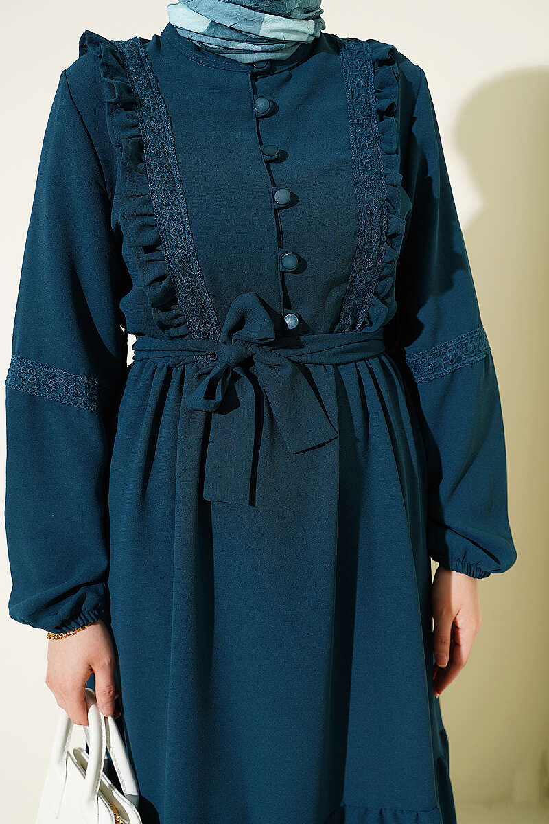 Brit Düğmeli Güpür Detaylı Elbise Petrol Yeşili