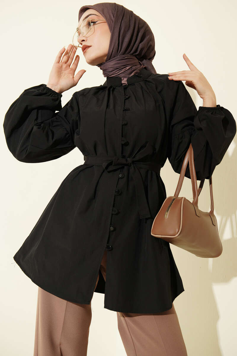 Brit Düğmeli Hakim Yaka Poplin Gömlek Siyah
