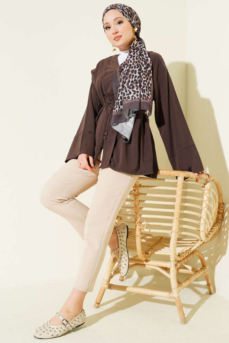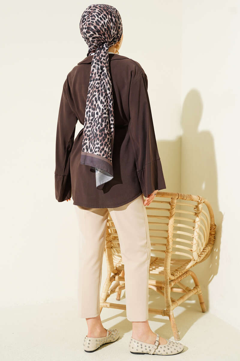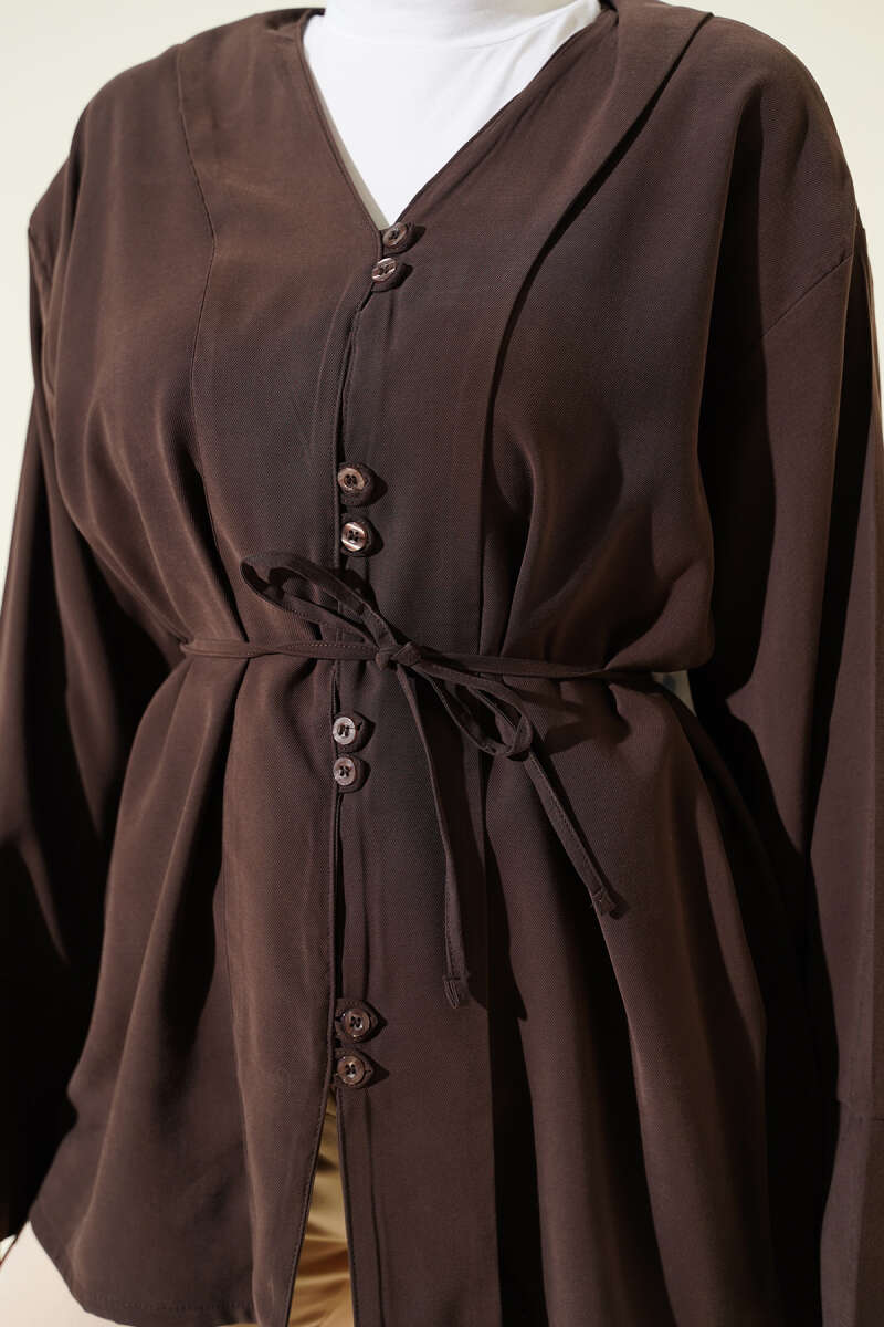 Brit Düğmeli İp Kuşaklı Tensel Gömlek Kahve