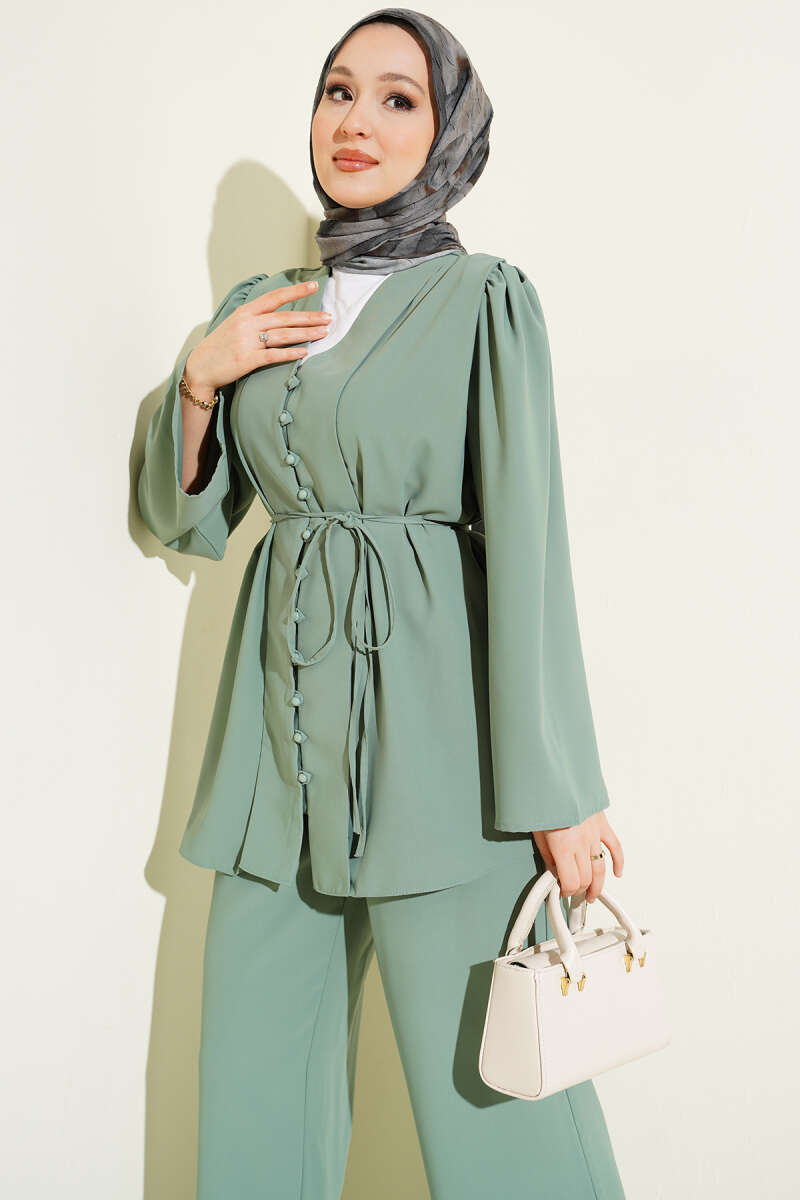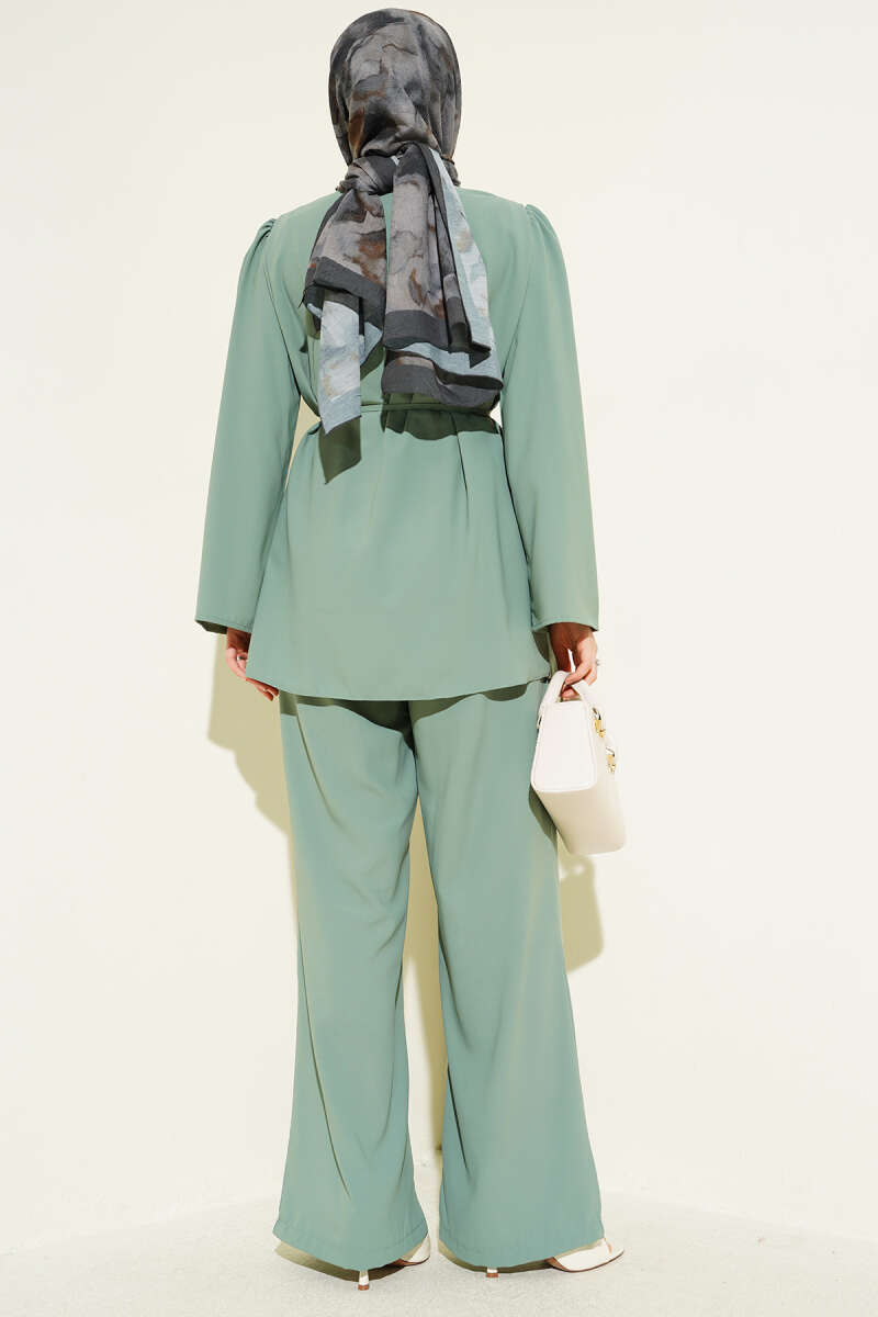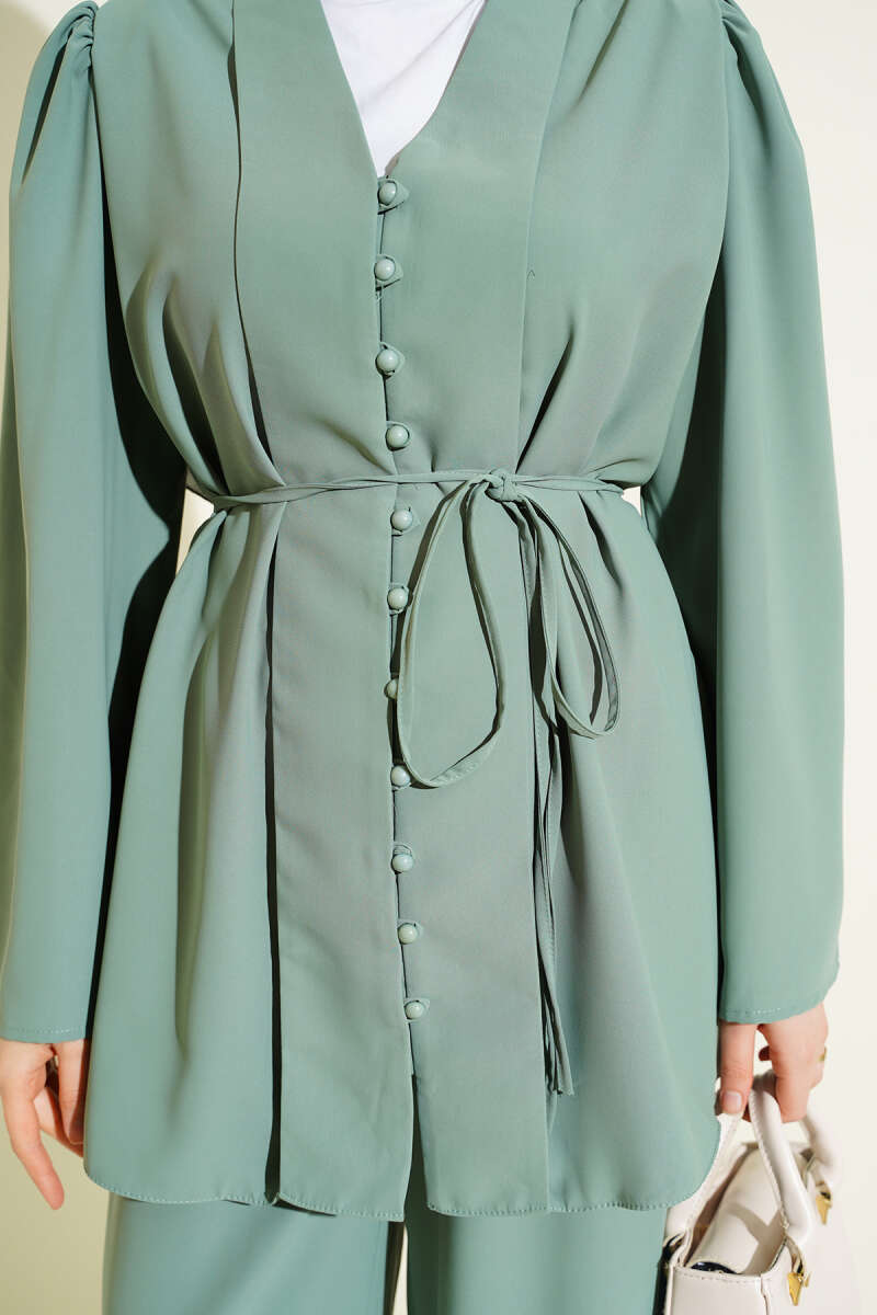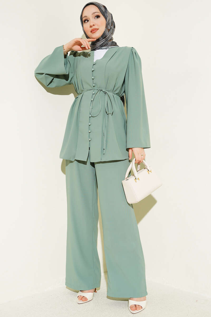 Brit Düğmeli İp Kuşaklı Tunik İkili Takım Pers Yeşili