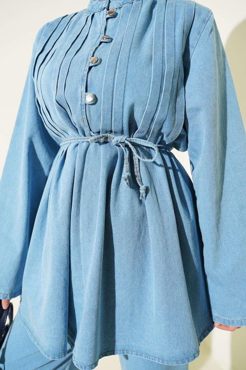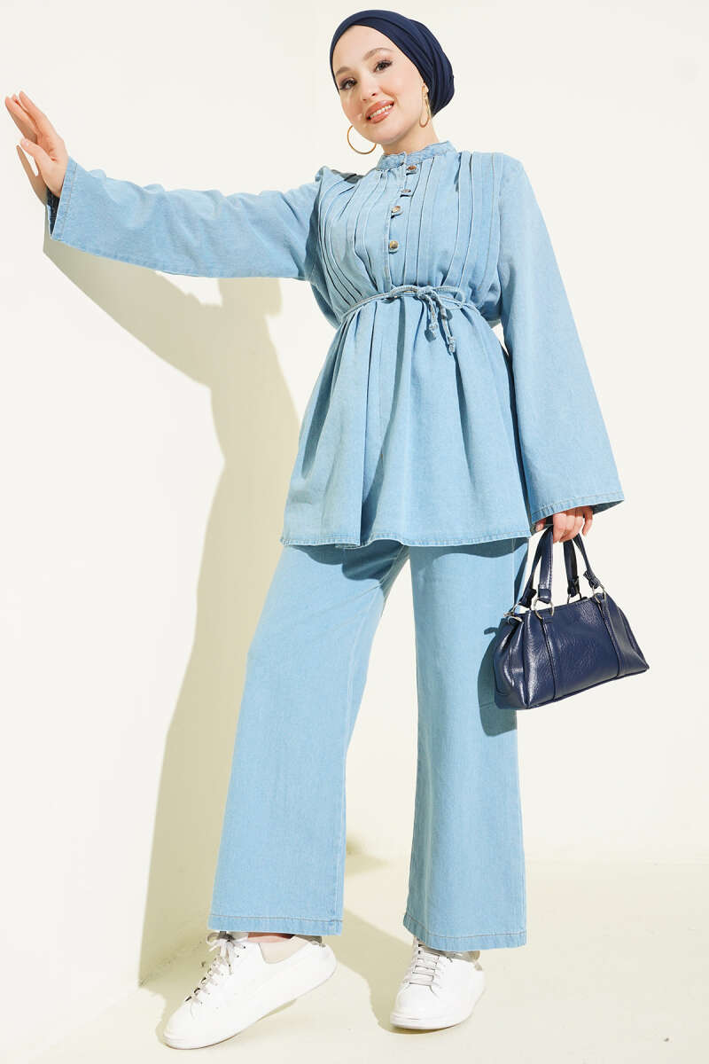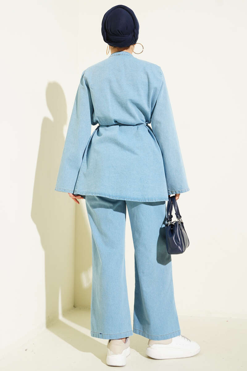 Brit Düğmeli Kot İkili Takım Açık Mavi