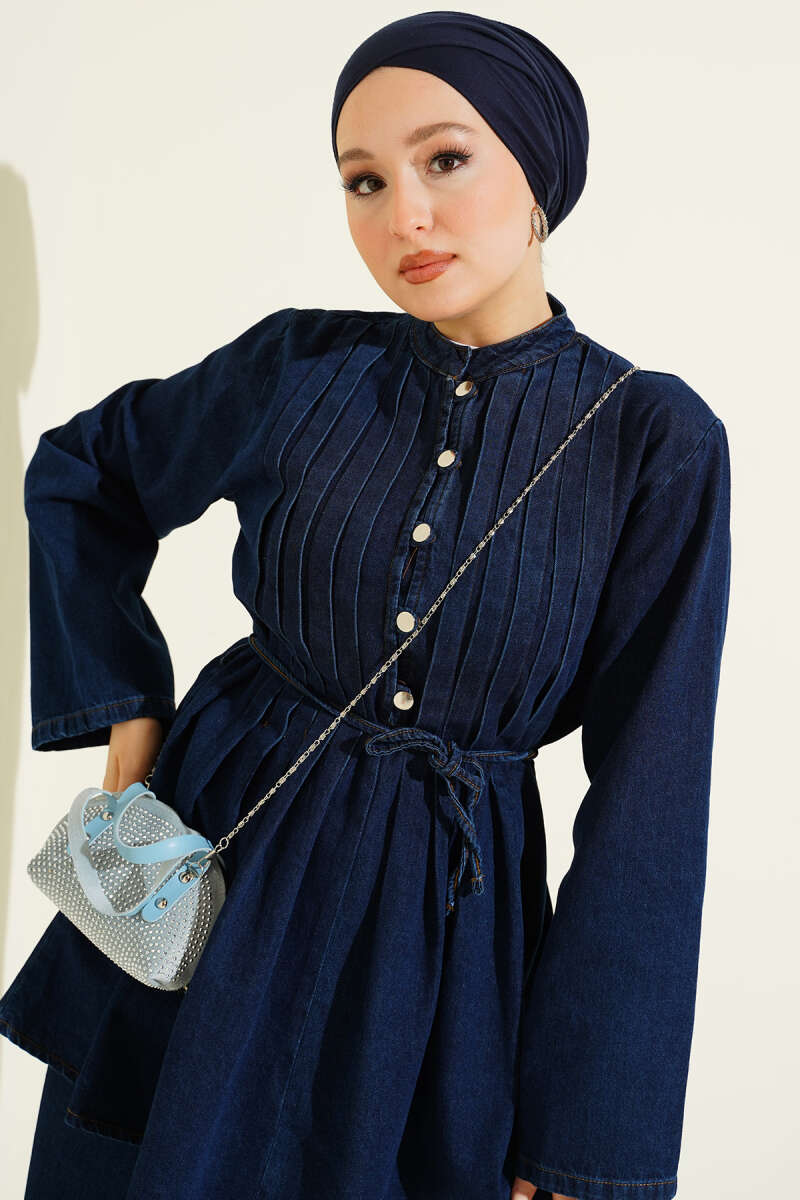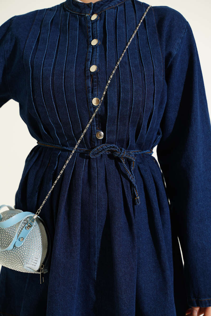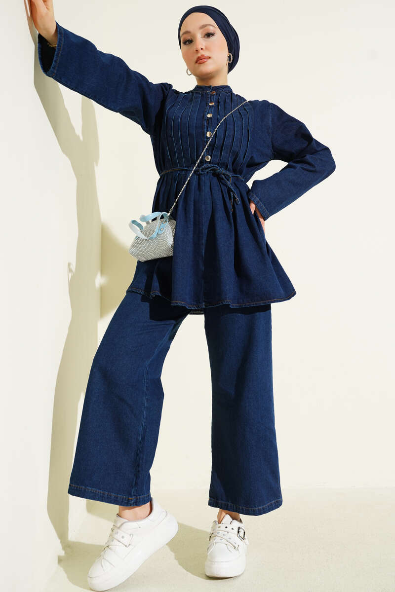 Kuşaklı Düğmeli Kot İkili Takım Lacivert