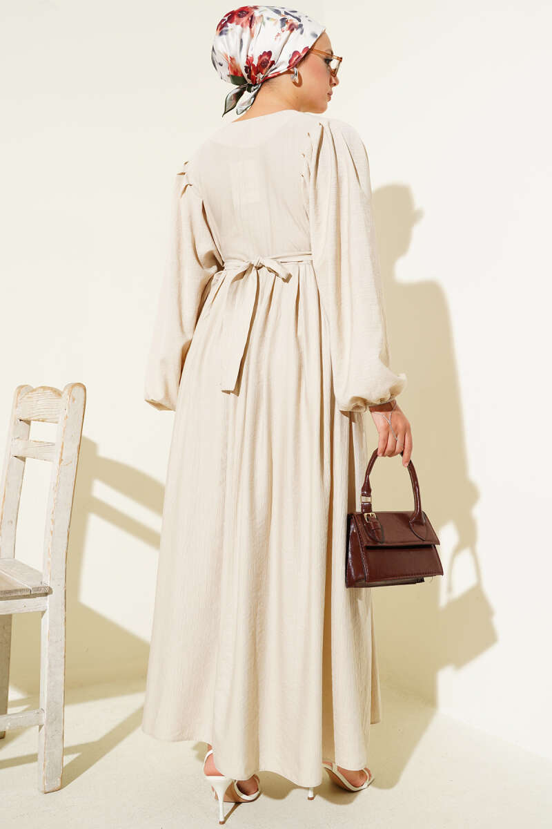 Omuz Pelerin Detaylı Abiye Elbise Bej