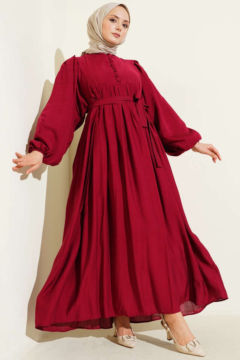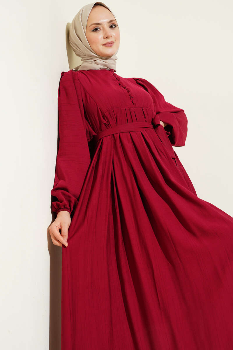 Brit Düğmeli Kuşaklı Elbise Bordo