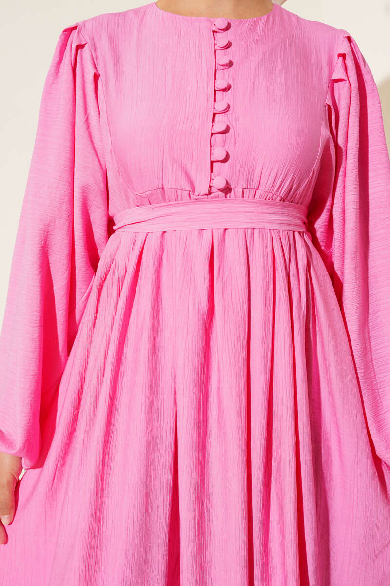 Brit Düğmeli Kuşaklı Elbise Pembe