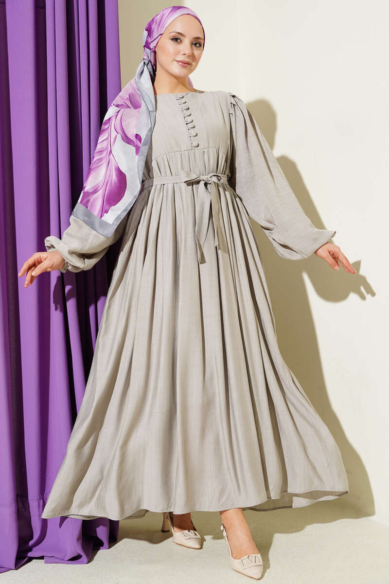 Bel Lastikli Metal Düğmeli Elbise Bej