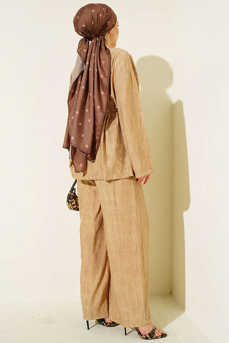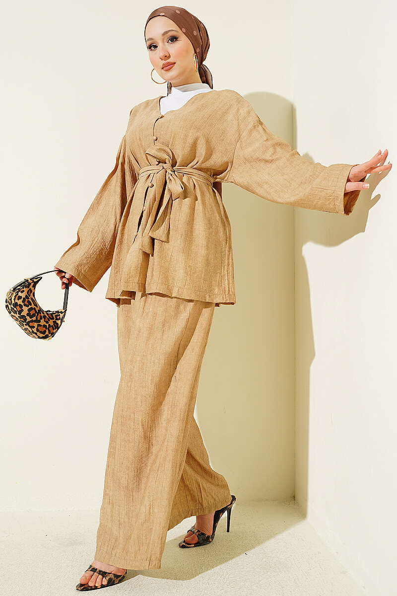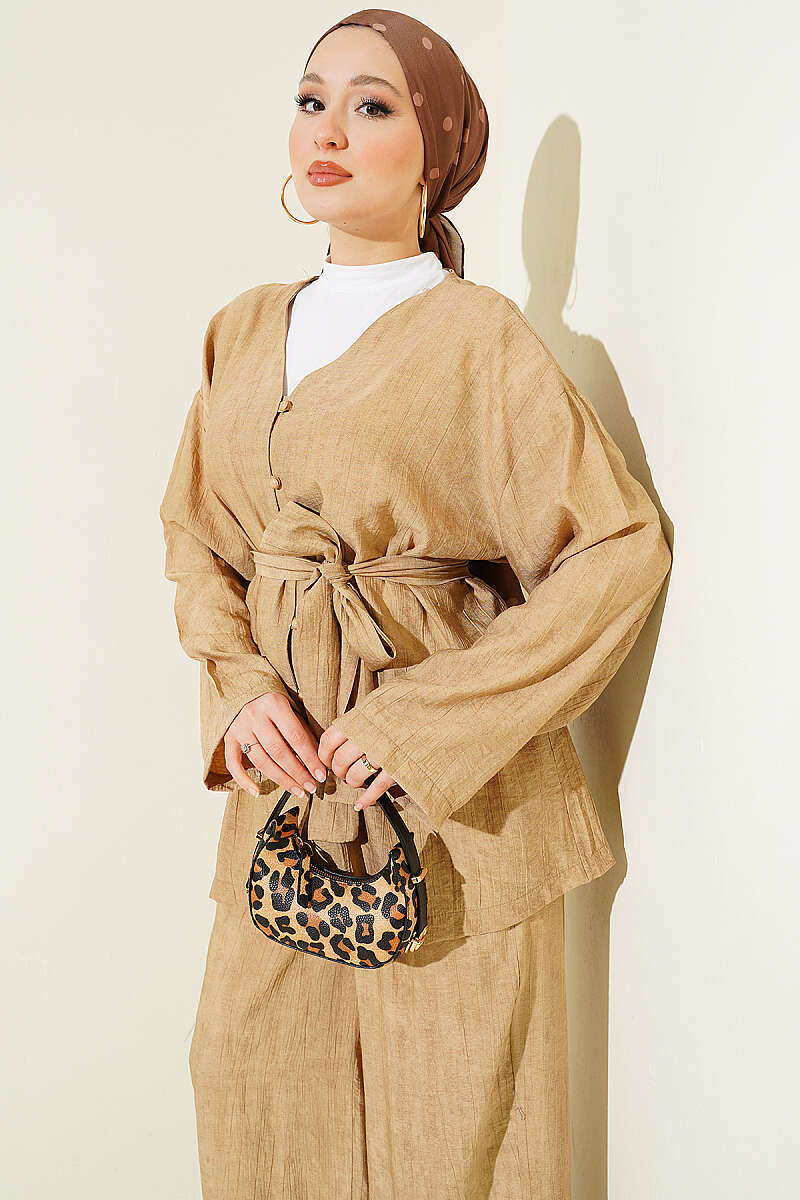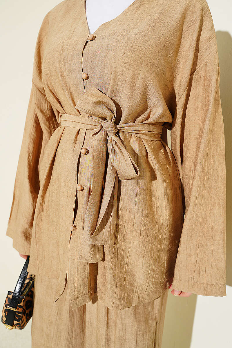 Brit Düğmeli Kuşaklı İkili Takım Latte