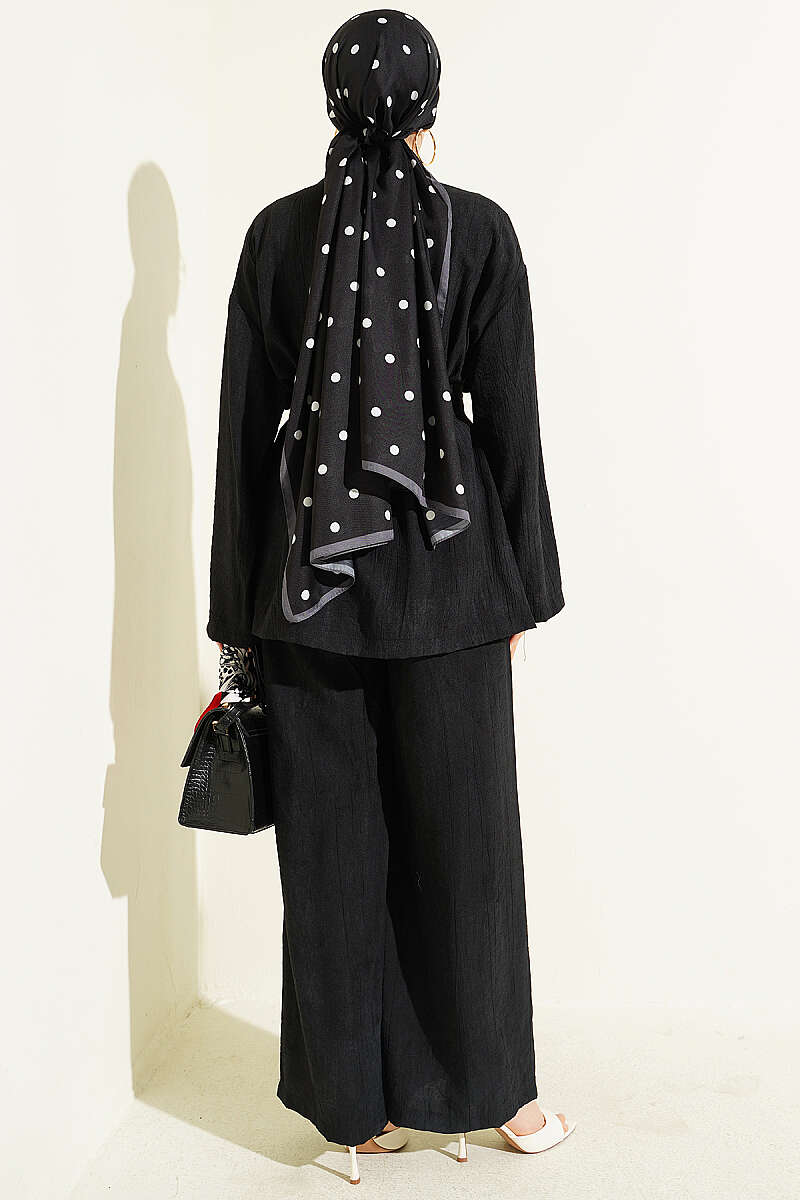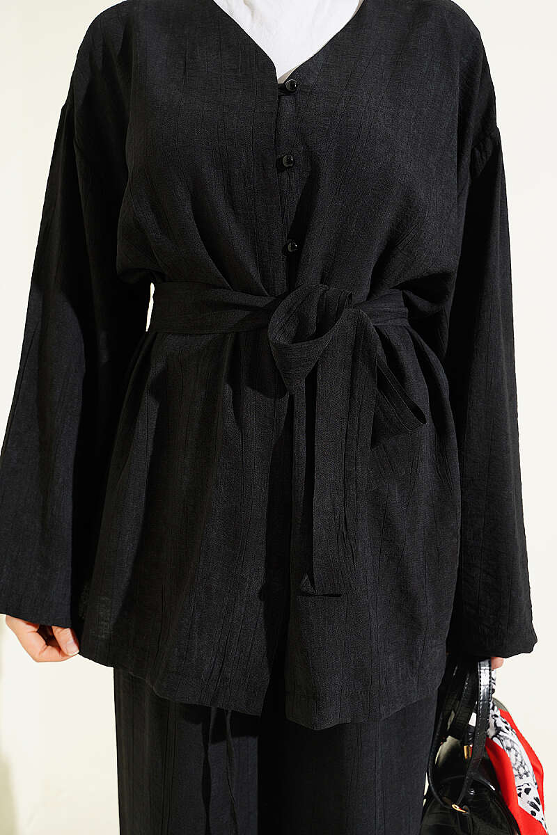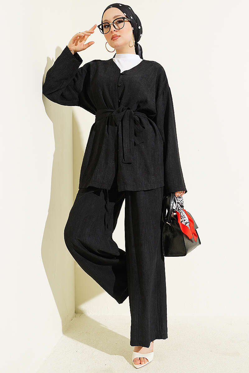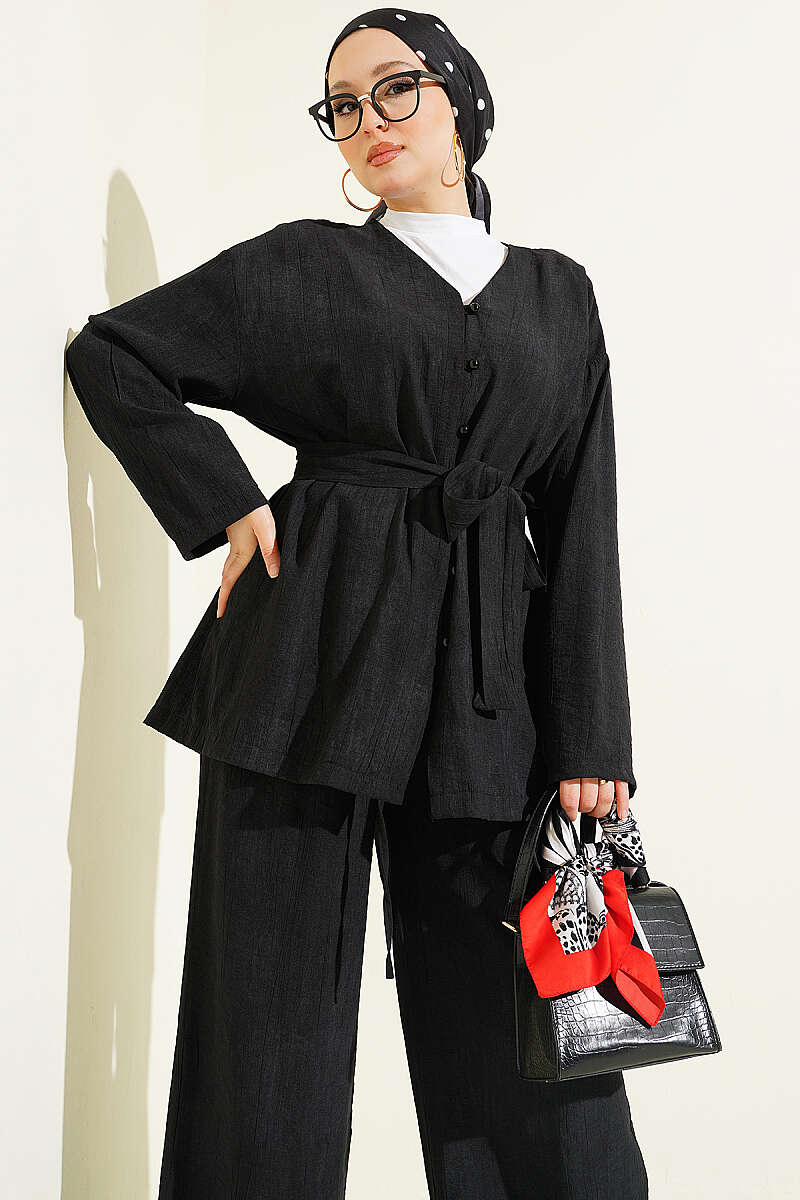 Brit Düğmeli Kuşaklı İkili Takım Siyah