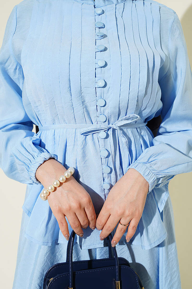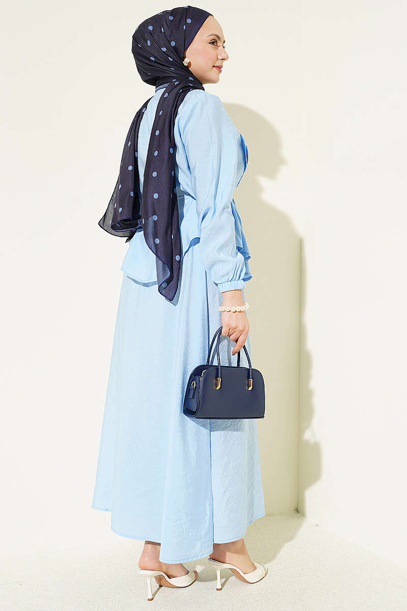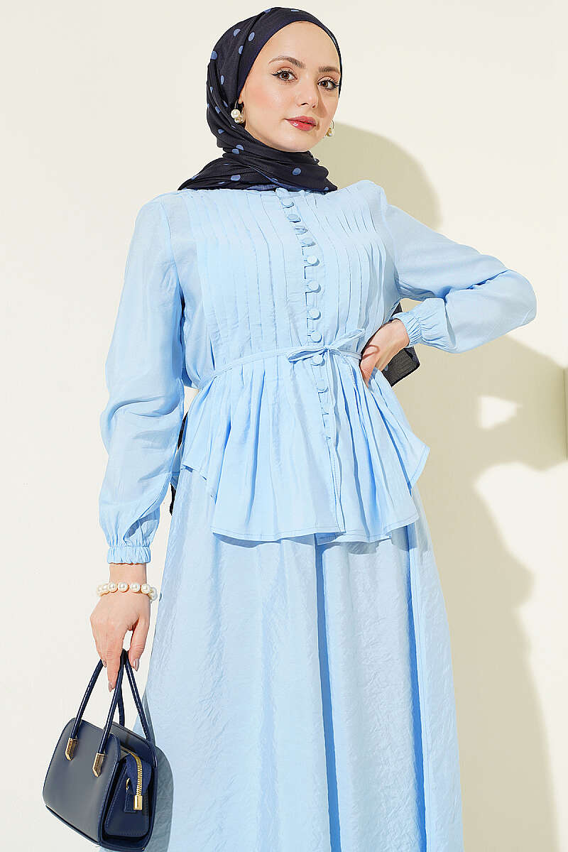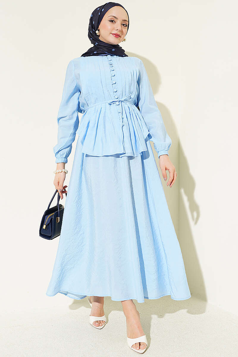 Bu takım, zarafeti ve ustalığı bir araya getiren nervür detayları ve klasik brit düğmeleriyle sofistike bir stil sunar. Belden oturan ve volanlı inen üst parçası, aynı dokuya sahip dökümlü eteğiyle birleşerek bütüncül ve feminen bir silüet oluşturur. Tasarımdaki ince dikiş işçiliği ve zarif düğme kapanışı, takıma hem klasik hem de modern bir hava katarak özel günlerden günlük şıklığa kadar geniş bir kullanım alanı sağlar. Hafif ve akışkan kumaş yapısı sayesinde gün boyu konfor sunan bu kombin, zahmetsizce şık görünmek isteyenler için ideal bir tercihtir.