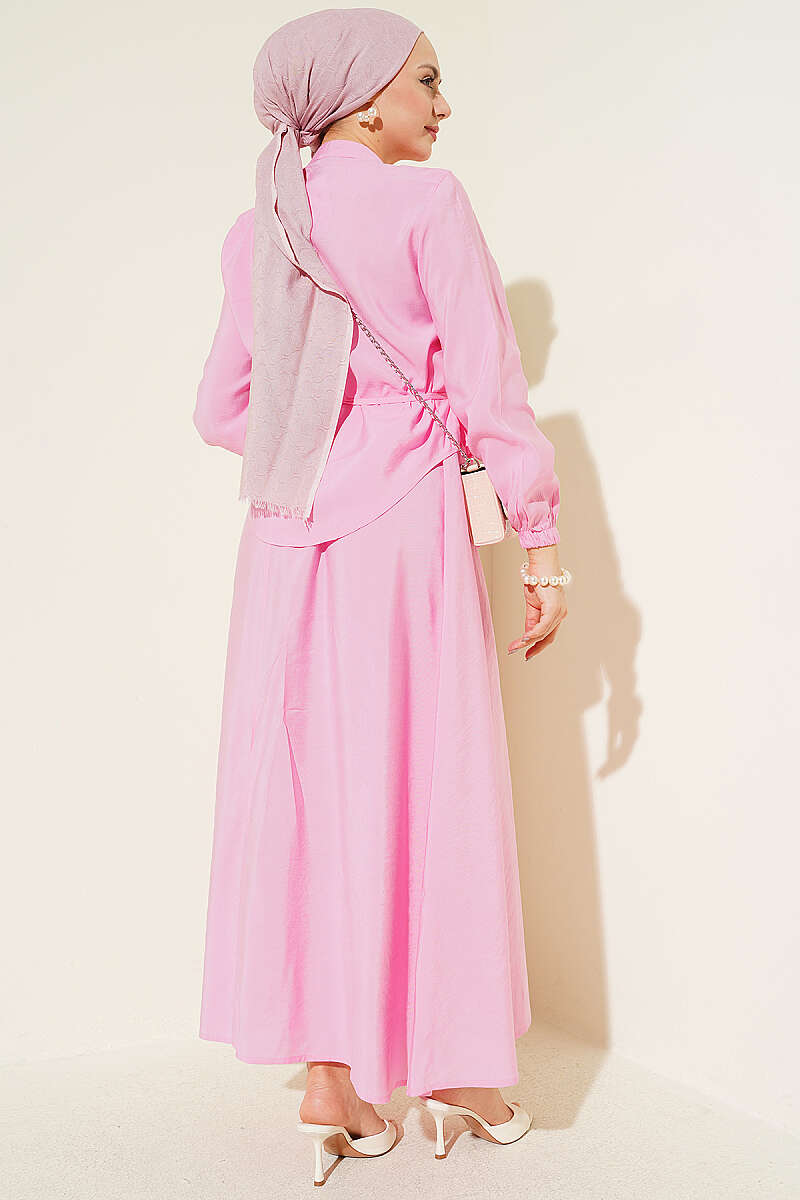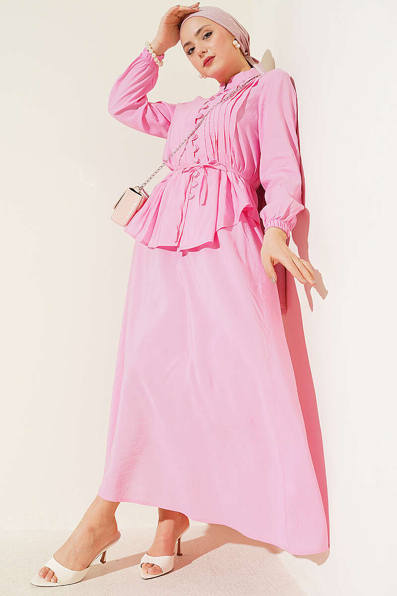 Brit Düğmeli Nervürlü Etekli Takım Pembe