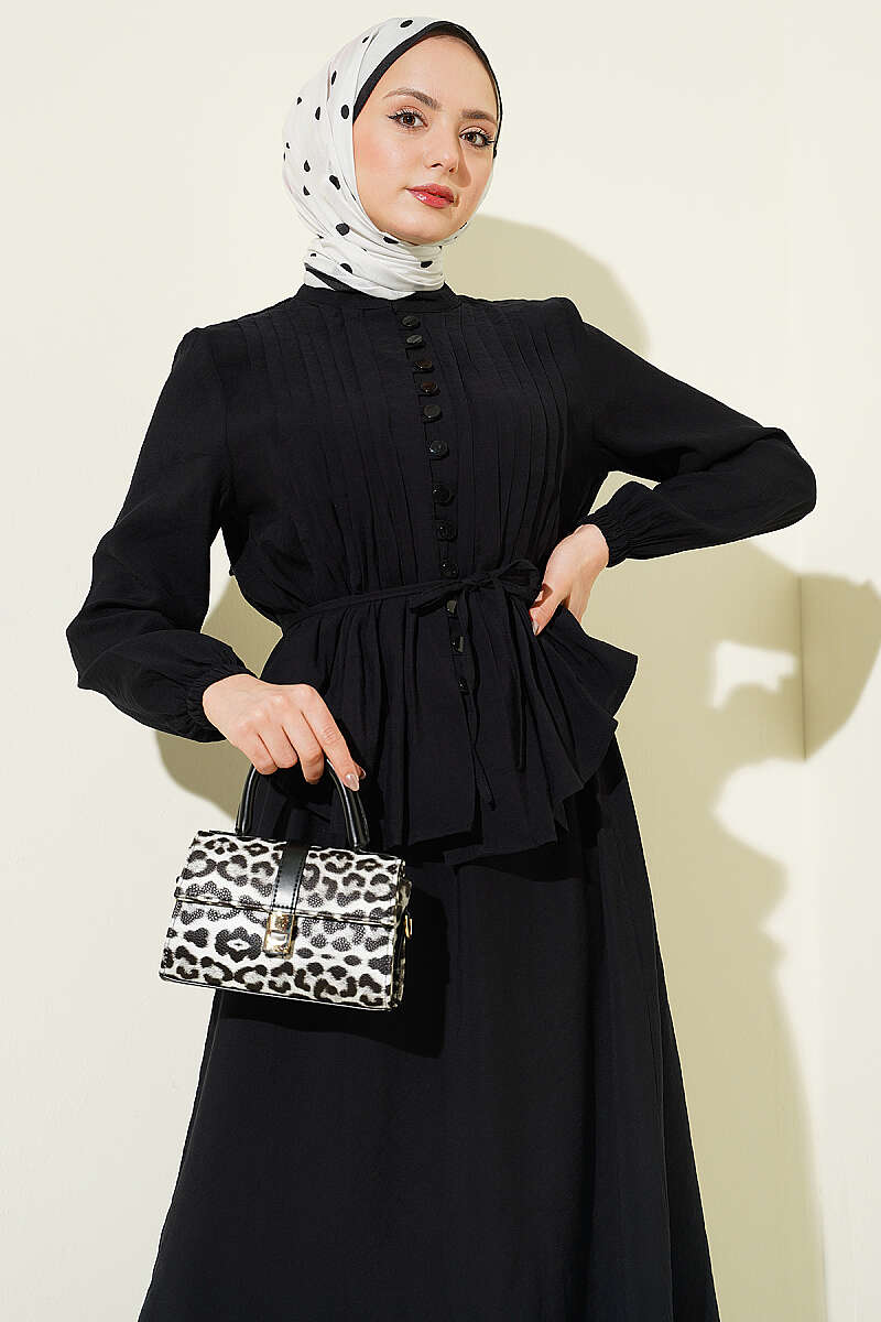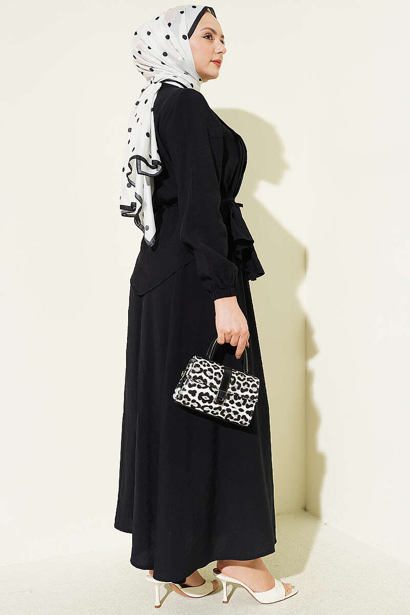 Bu takım, zarafeti ve ustalığı bir araya getiren nervür detayları ve klasik brit düğmeleriyle sofistike bir stil sunar. Belden oturan ve volanlı inen üst parçası, aynı dokuya sahip dökümlü eteğiyle birleşerek bütüncül ve feminen bir silüet oluşturur. Tasarımdaki ince dikiş işçiliği ve zarif düğme kapanışı, takıma hem klasik hem de modern bir hava katarak özel günlerden günlük şıklığa kadar geniş bir kullanım alanı sağlar. Hafif ve akışkan kumaş yapısı sayesinde gün boyu konfor sunan bu kombin, zahmetsizce şık görünmek isteyenler için ideal bir tercihtir.