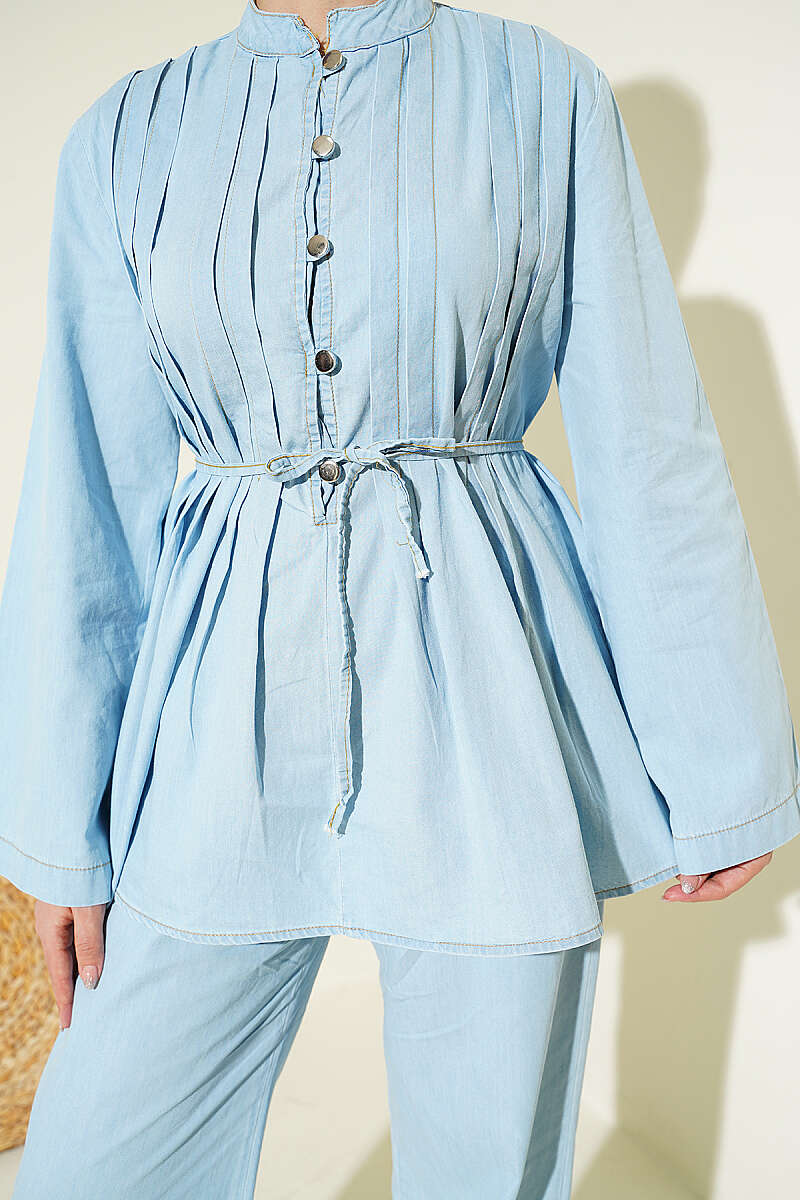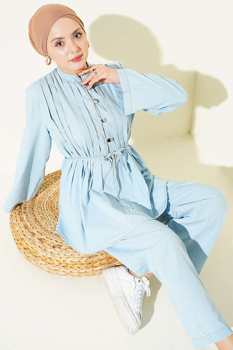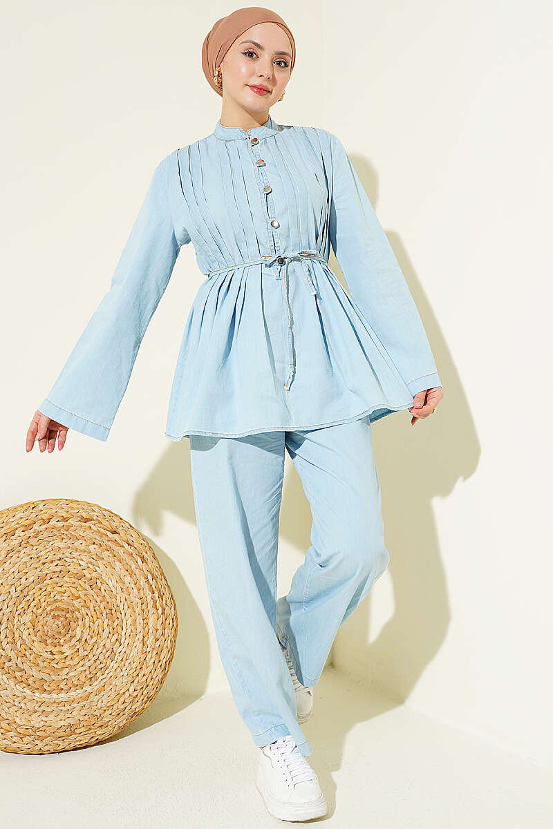 Taş Düğmeli Fularlı Modal İkili Takım Bebe Mavi