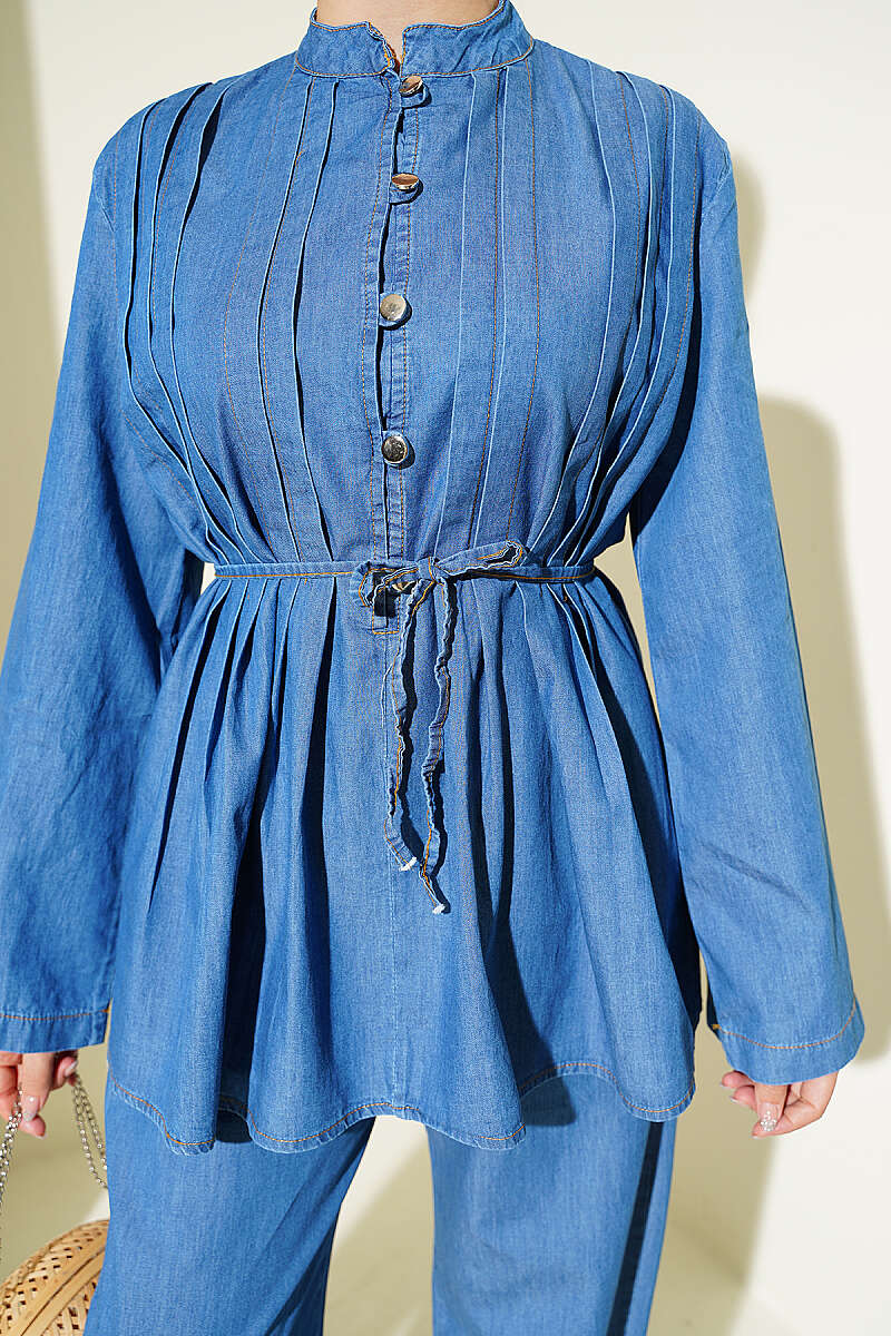 Taş Düğmeli Fularlı Modal İkili Takım Lacivert