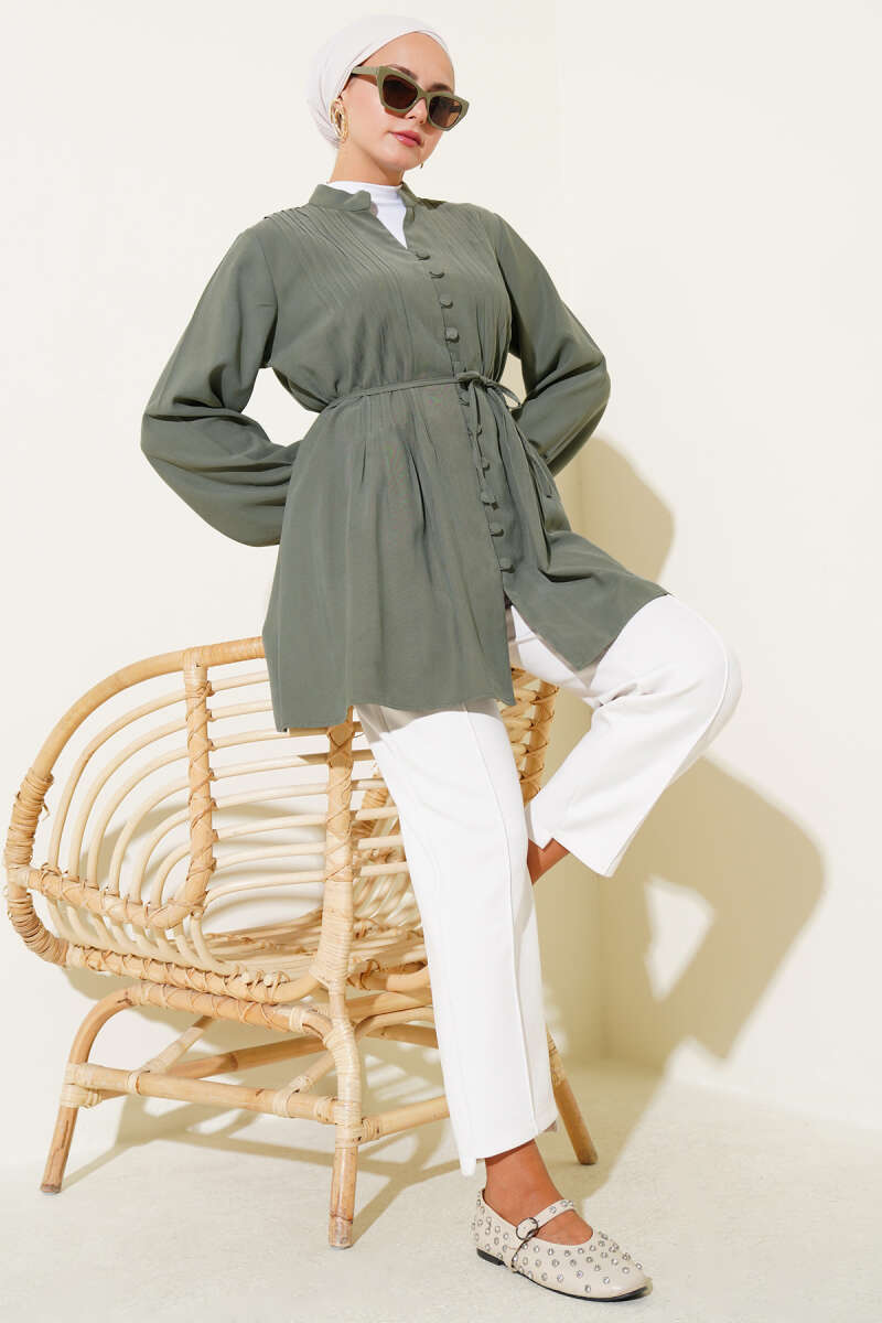 Taş Düğmeli Omuz Pileli Gömlek Bej