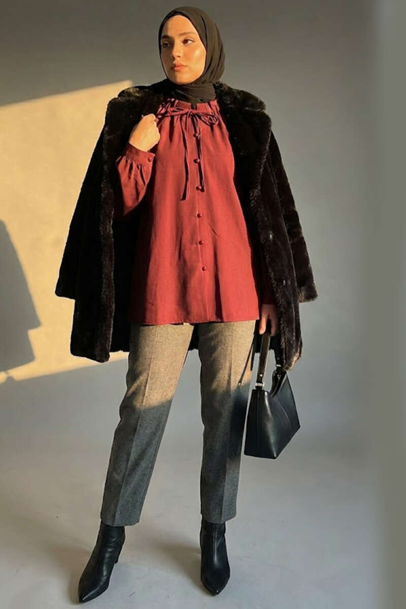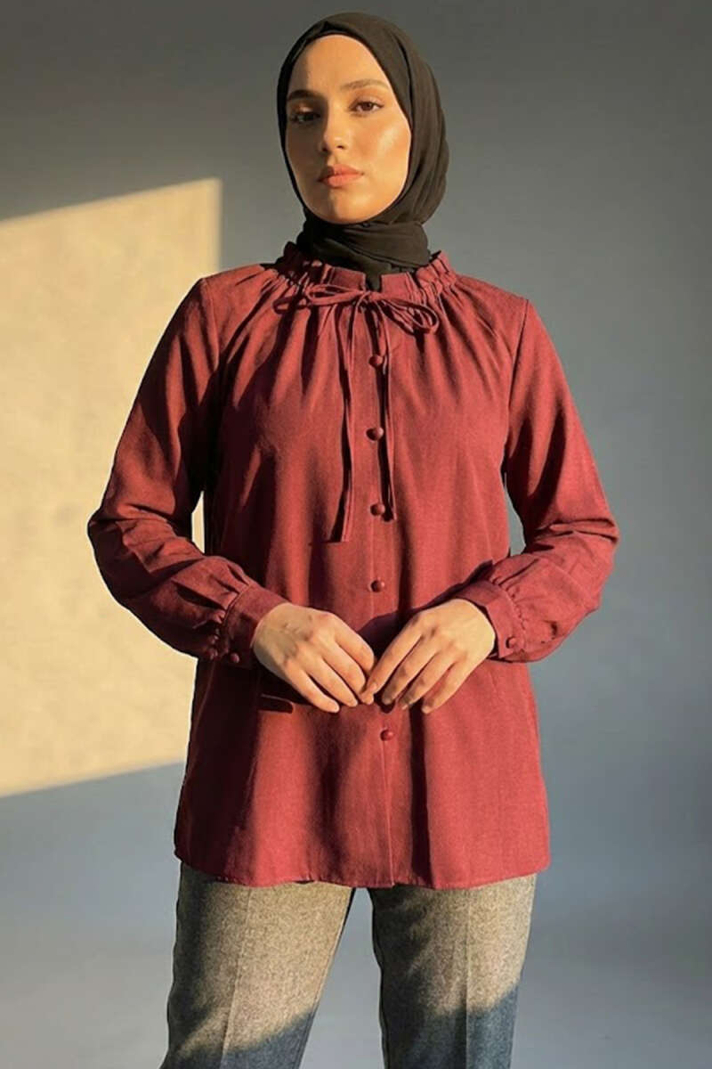 Önü Pileli İp Kuşaklı Tunik Bordo