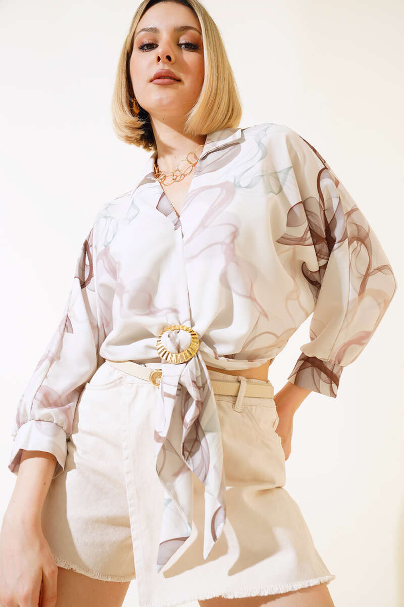 Sezonun şık parçası bluzumuz favorilerinizin arasında yerini alacak. Bluzum bronşlu ve önden bağlamalıdır. Bluzumuz yarasa kolludur. Bluzumuz uzun kolludur. Şık tasarımıyla yazın favori parçanız olacaktır. Dolabınızdaki yerini bekliyor.
