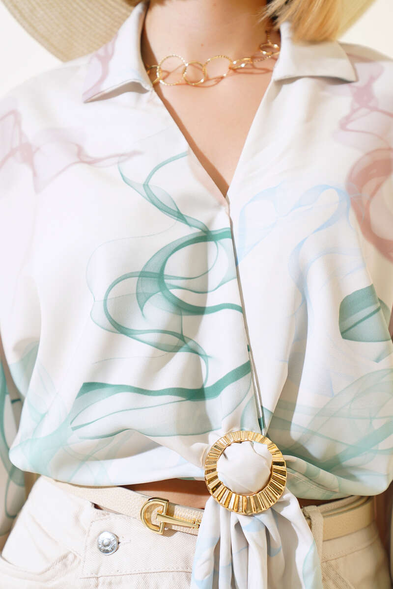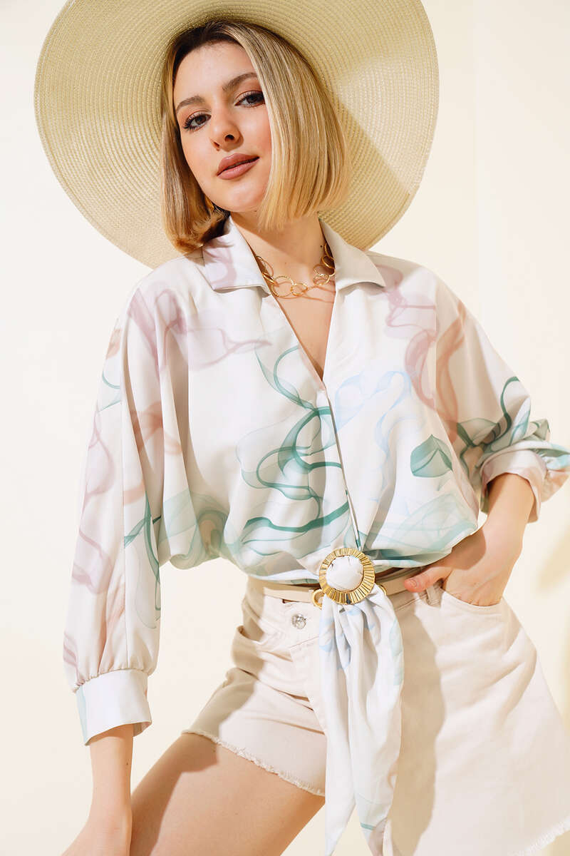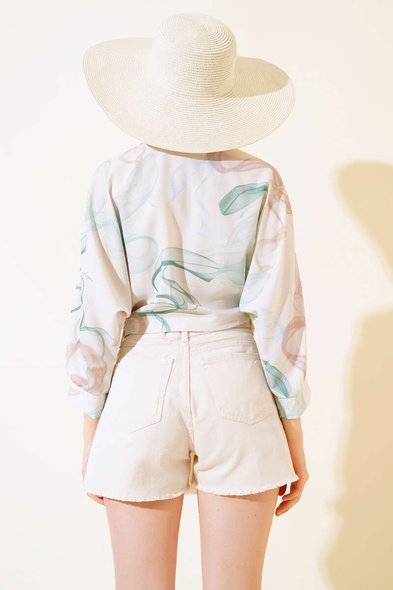 Sezonun şık parçası bluzumuz favorilerinizin arasında yerini alacak. Bluzum bronşlu ve önden bağlamalıdır. Bluzumuz yarasa kolludur. Bluzumuz uzun kolludur. Şık tasarımıyla yazın favori parçanız olacaktır. Dolabınızdaki yerini bekliyor.