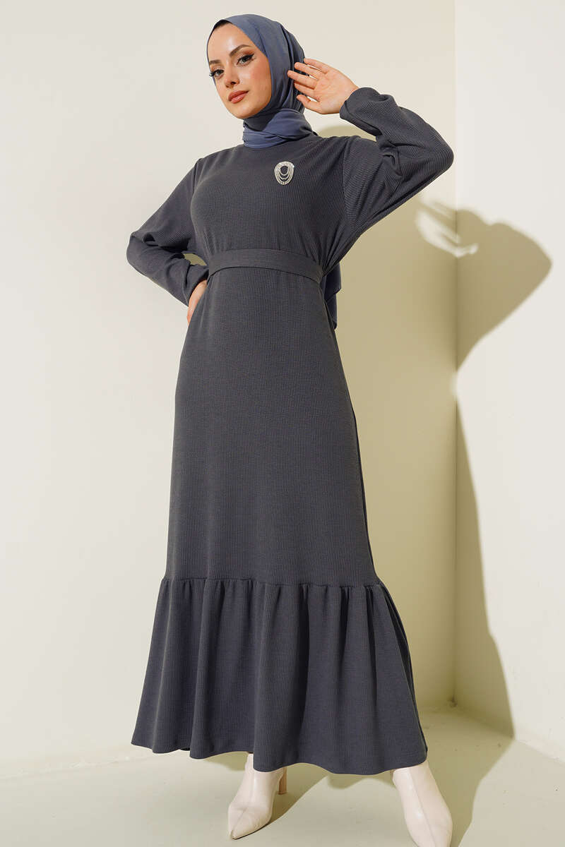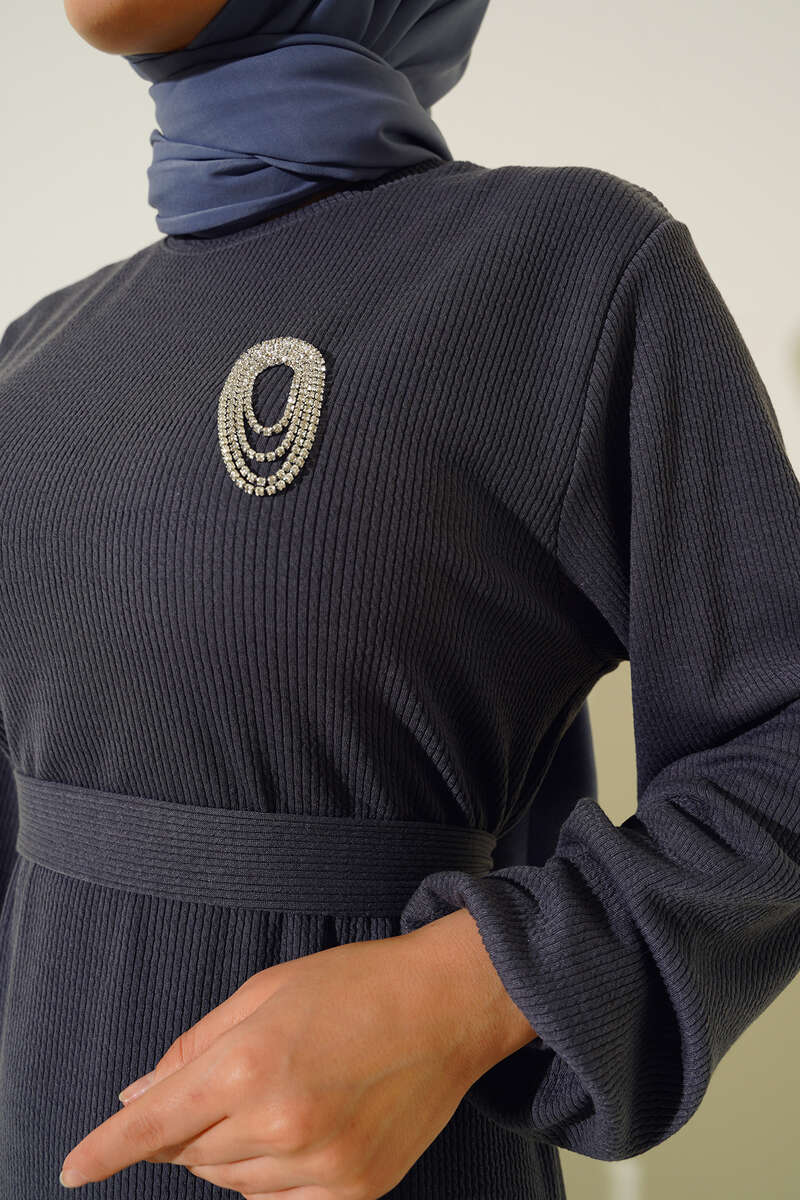 Broş Detaylı Burgu Fitilli Elbise Füme