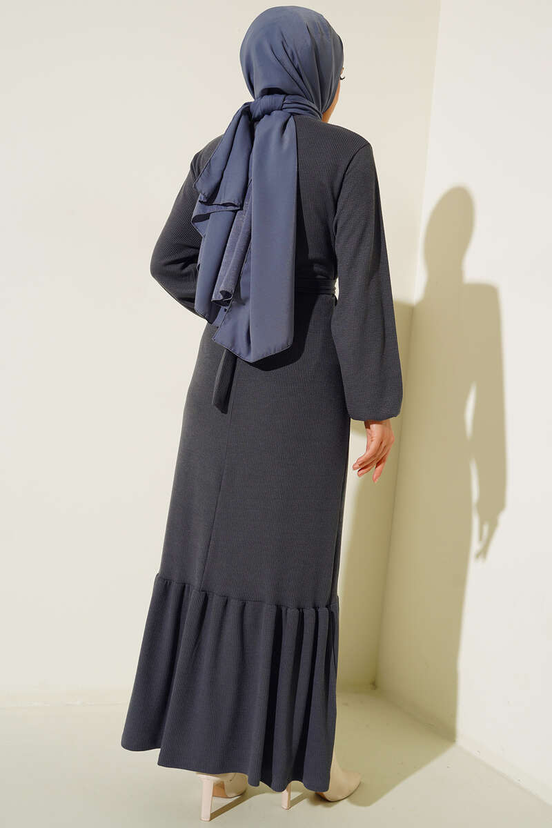 Ajurlu İp Kuşaklı Triko Elbise Füme