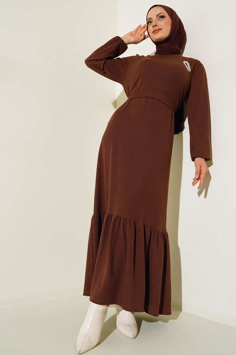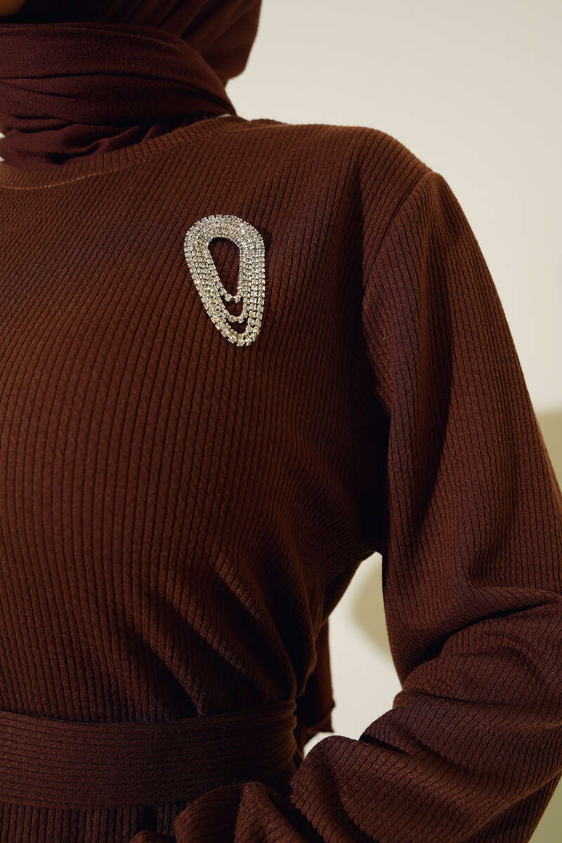 Broş Detaylı Burgu Fitilli Elbise Kahve