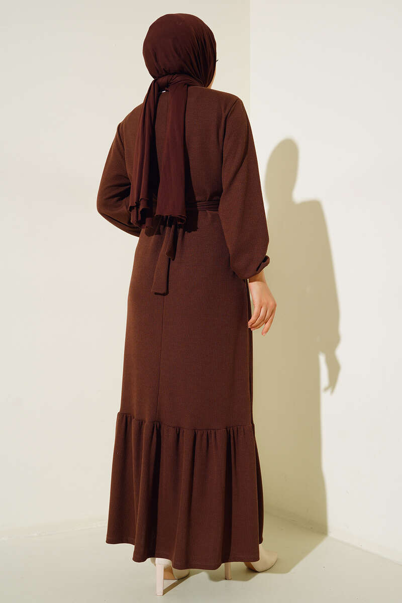 Ajurlu İp Kuşaklı Triko Elbise Kahve