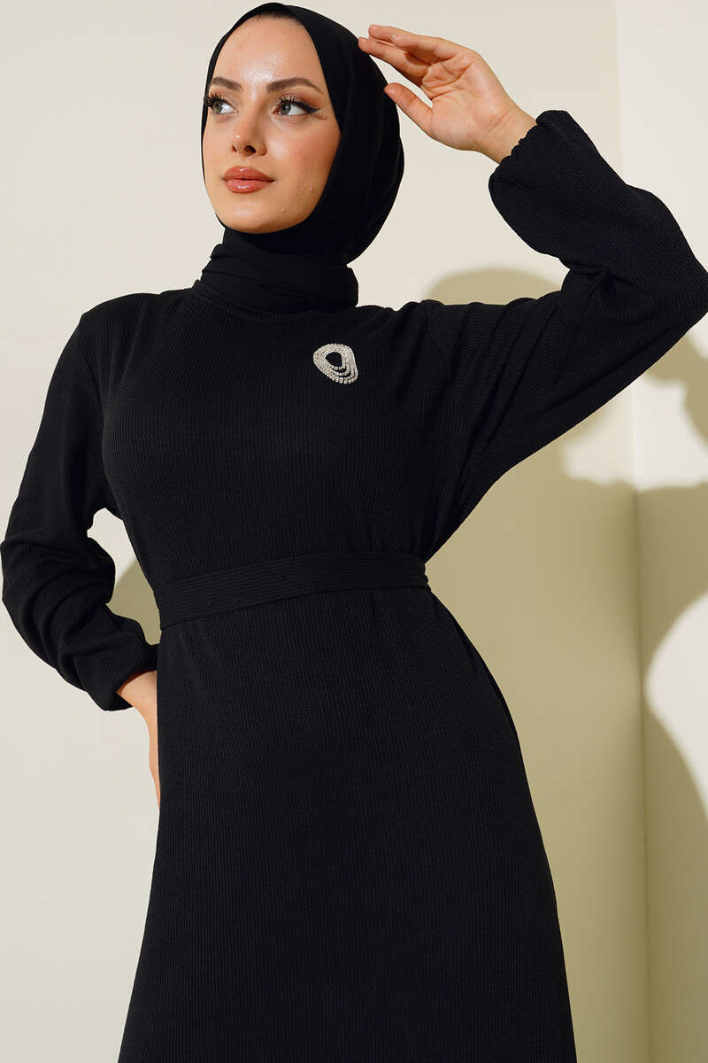 Broş Detaylı Burgu Fitilli Elbise Siyah