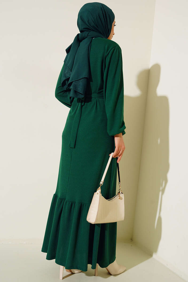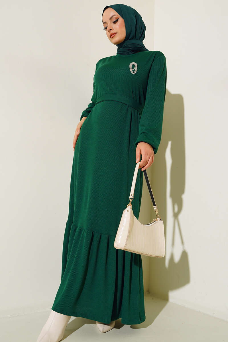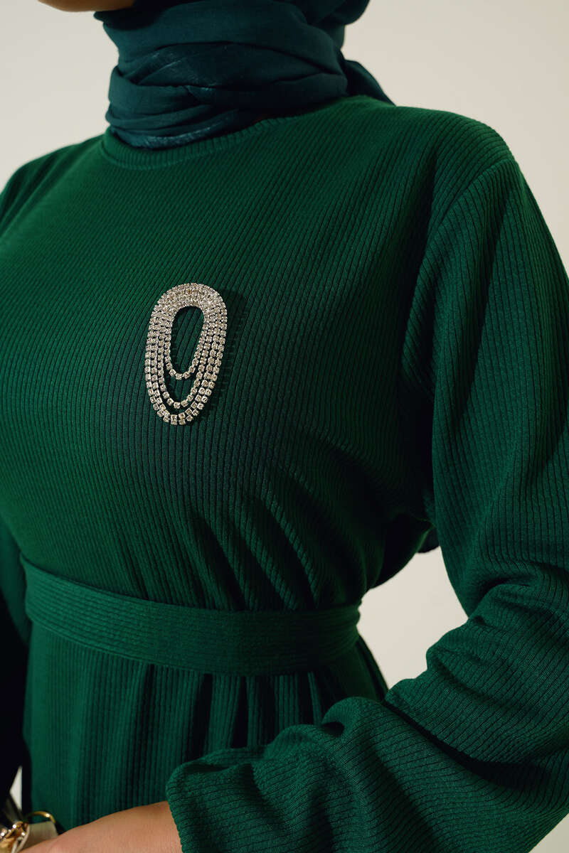 Yeni sezon burgu fitilli elbisemiz göğsünde bulunan broş süslemesiyle beğenileri üzerinde toplamaktadır. Bilekleri lastikli elbisemizin beli kuşaklıdır. Kuşağı kendi rengi ve kumaşındandır.