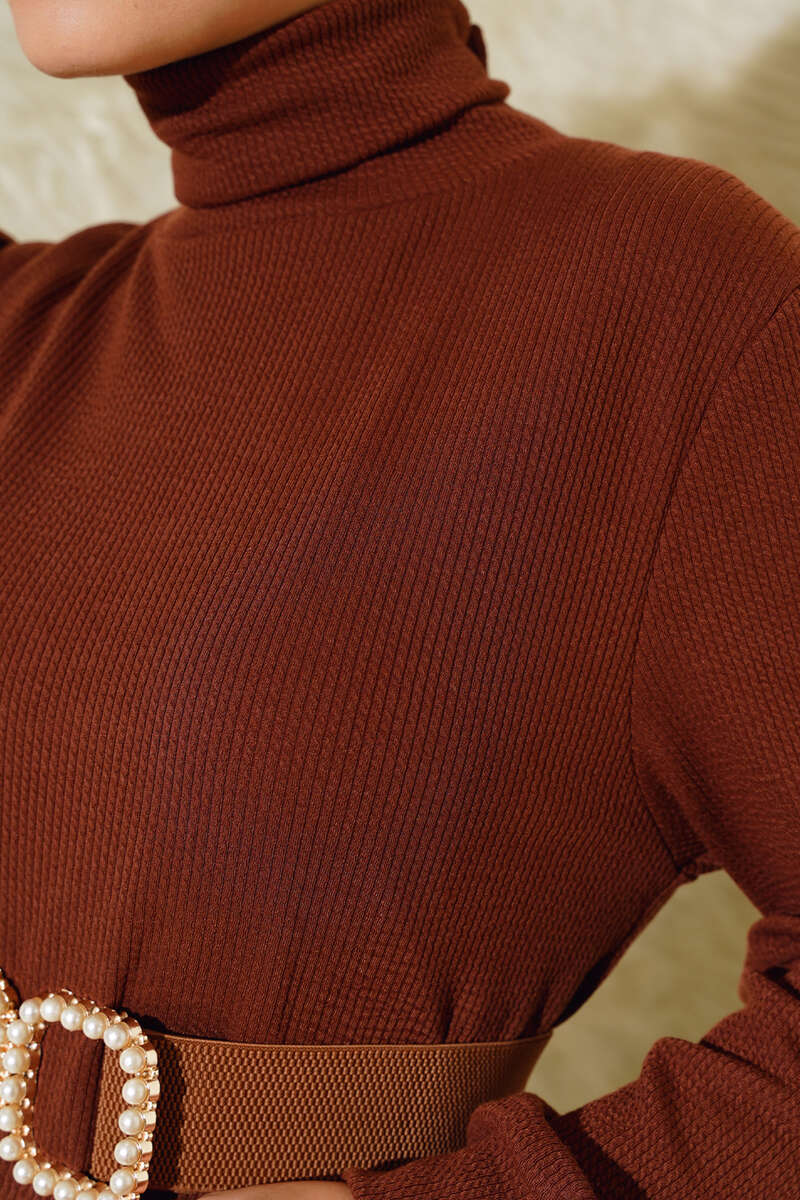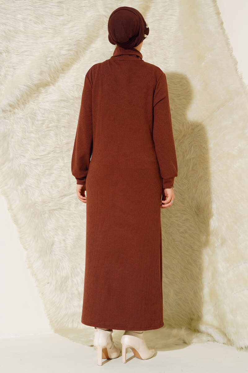 Burgu Fitilli Boğazlı Elbise Kiremit