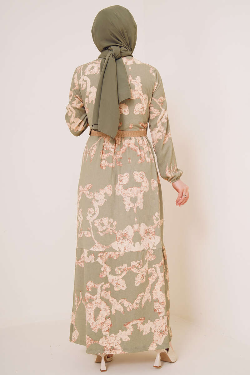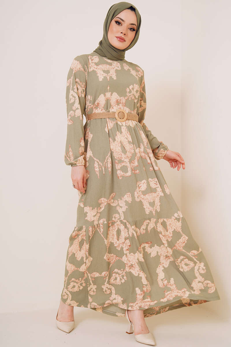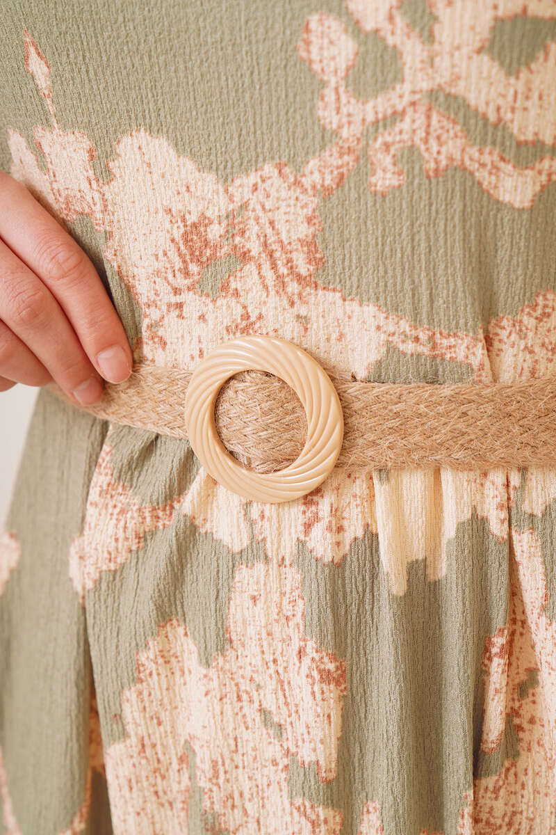 Bürümcük Desenli Kemerli Elbise Çağla Yeşili
