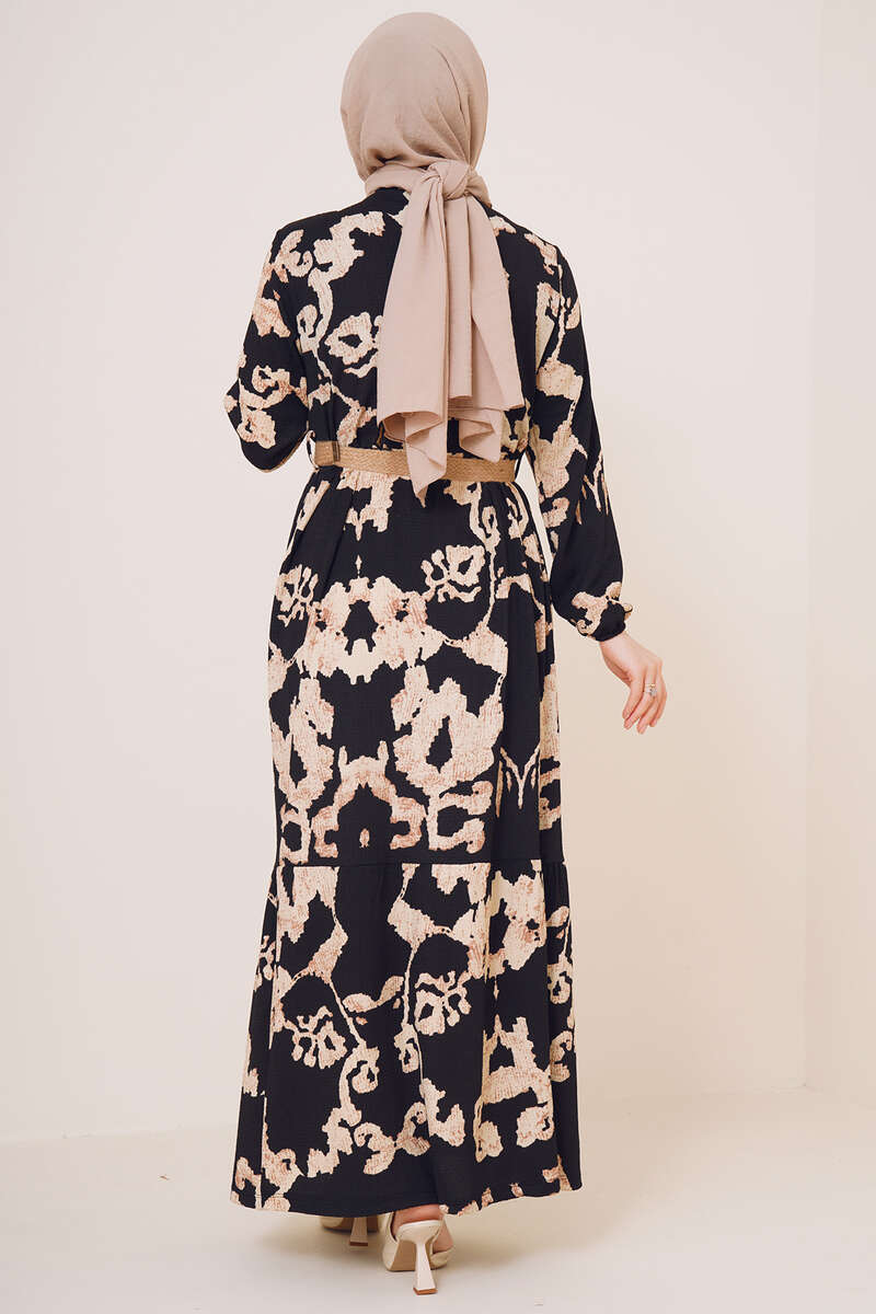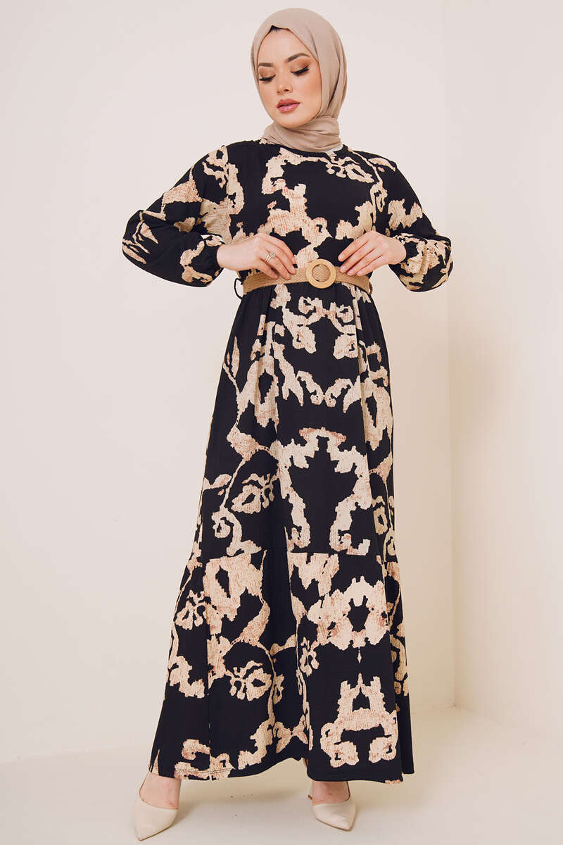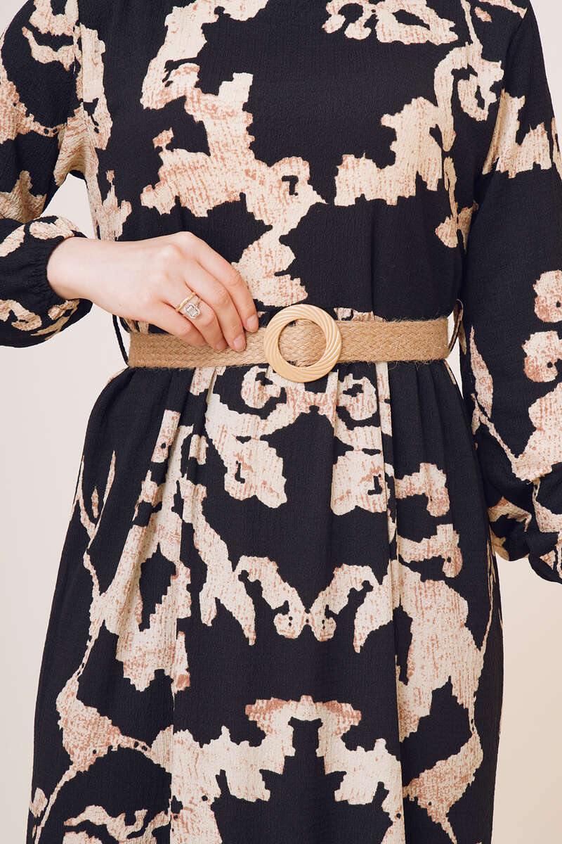 Bürümcük elbisemiz damga desenlerine sahiptir. Elbisemizin bel kısmında iki adet kemer köprüsü bulunmaktadır. Elbisemiz hasır kemere sahiptir.