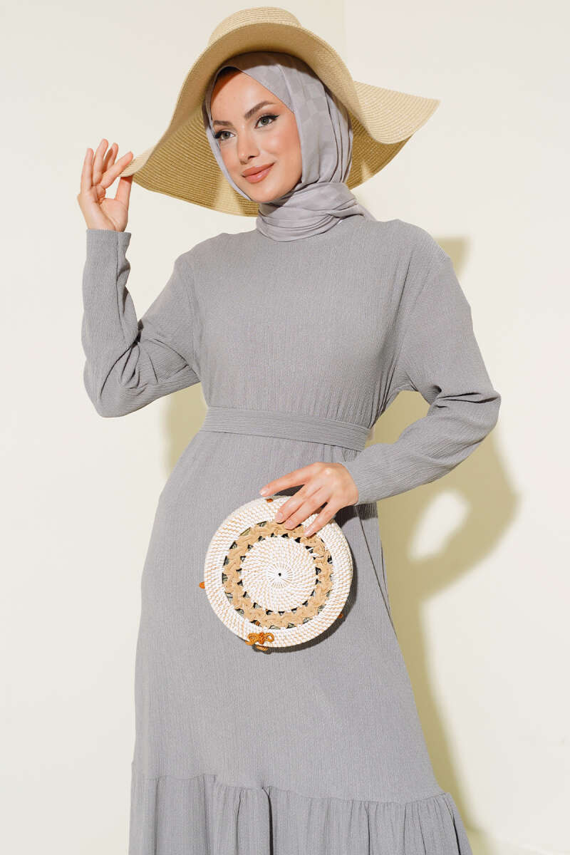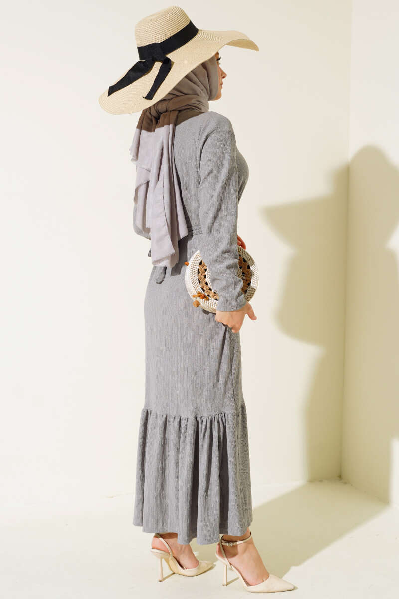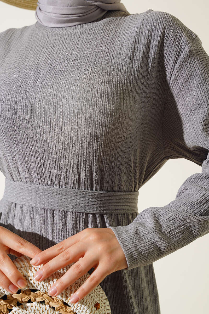 Balon Kol Kemerli Basic Elbise Gri