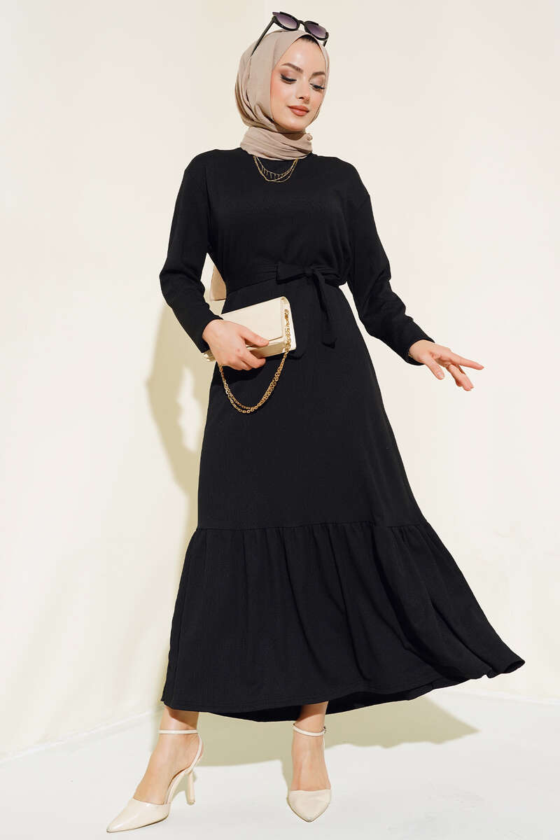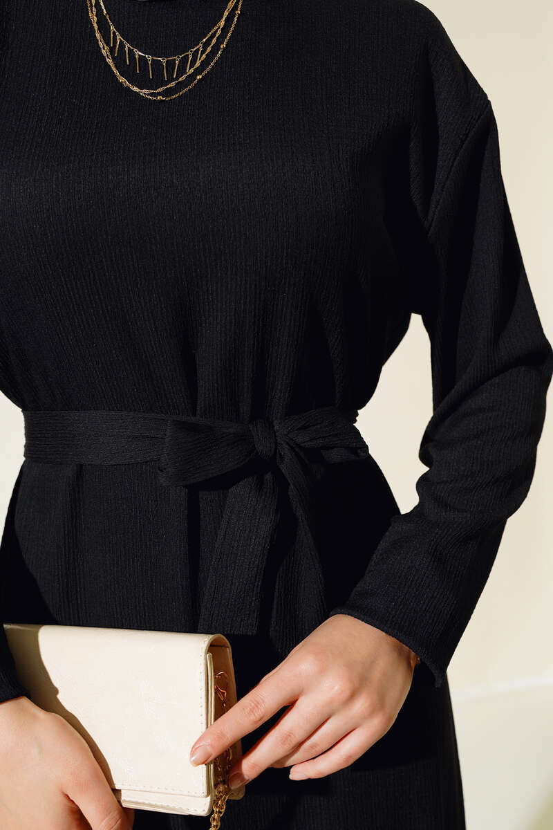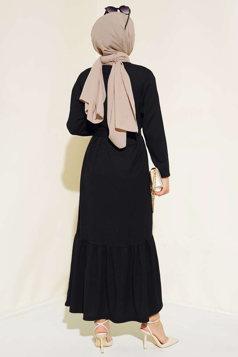 Bürümcüklü Kuşaklı Kat Elbise Siyah