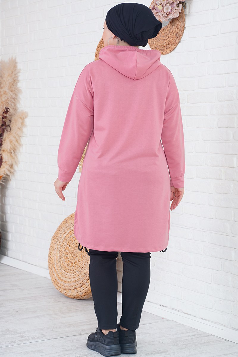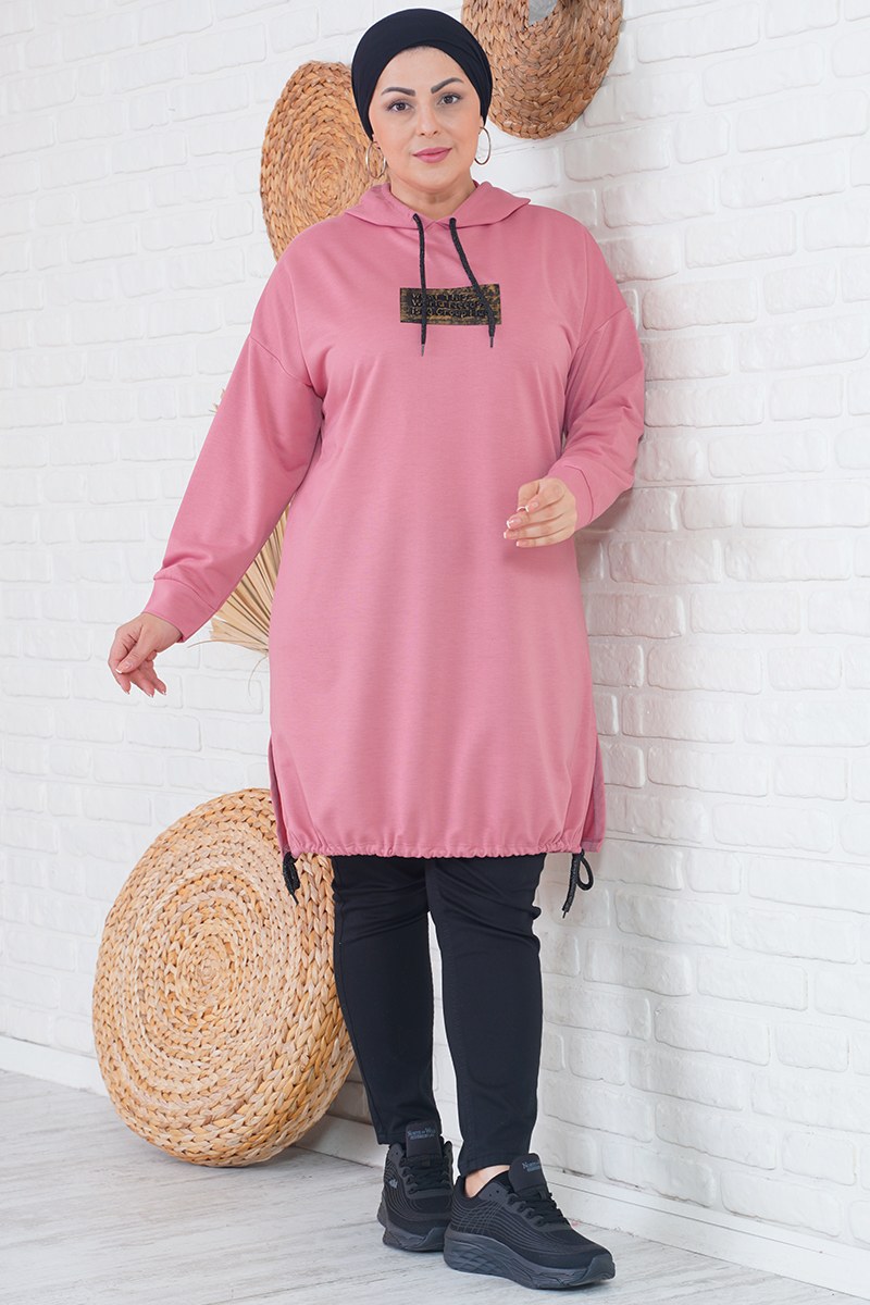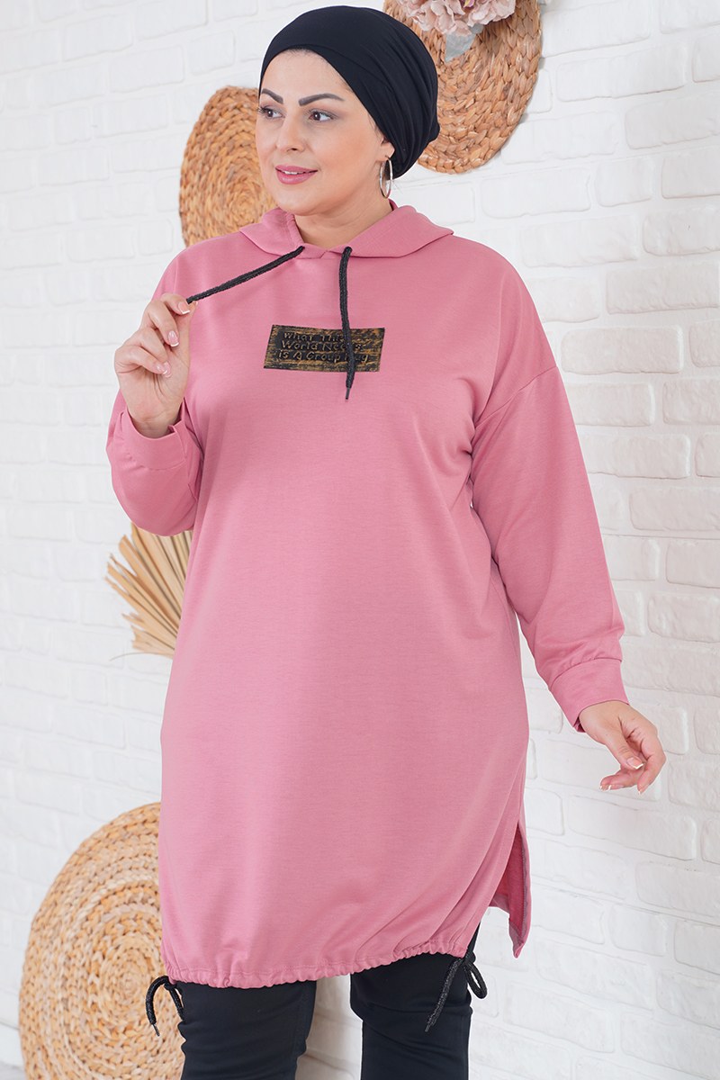 Yazı baskılı tunik yeni sezon modeldir. Büyük beden tunik gül kurusu renklidir. Düşük omuzludur. Kapüşonlu, yakası simli bağcıklıdır. Etek ucu büzdürebilen bağcıklıdır. Kolları manşetlidir. Renk seçeneği mevcuttur.