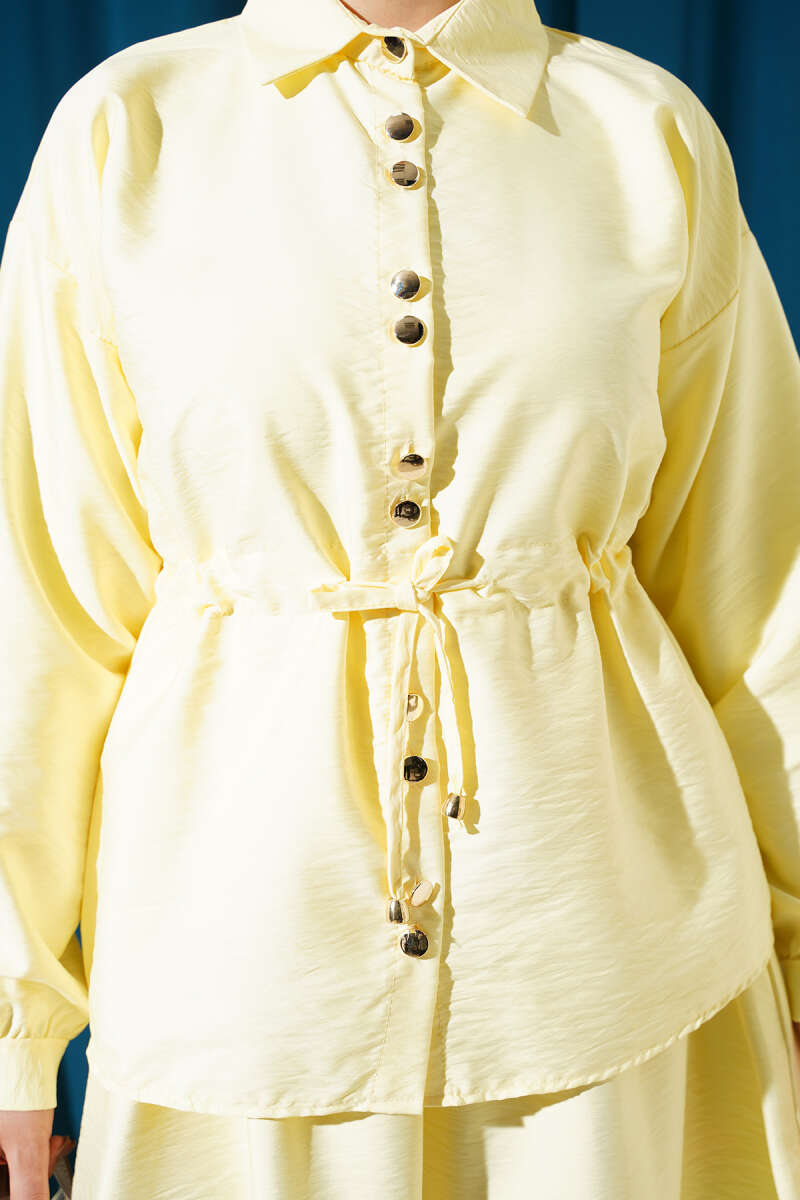 Büzgü detayıyla modern silüeti birleştiren bu ikili takım, tek bir dokunuşla eksiksiz bir kombin sunuyor. Akışkan kumaşı ve zarif detaylarıyla gün boyu hem çok şık hem de çok rahat hissedeceksiniz.