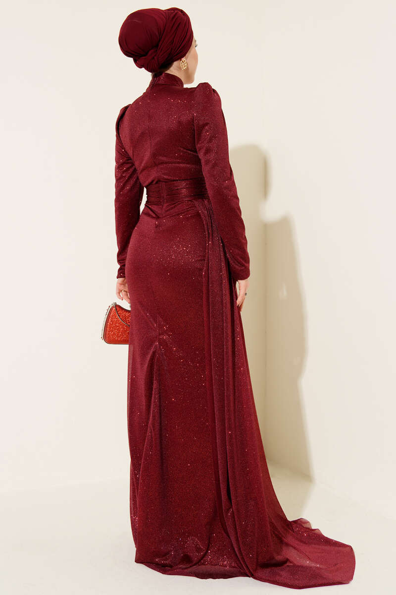 Bel Taşlı Pelerinli Abiye Elbise Bordo