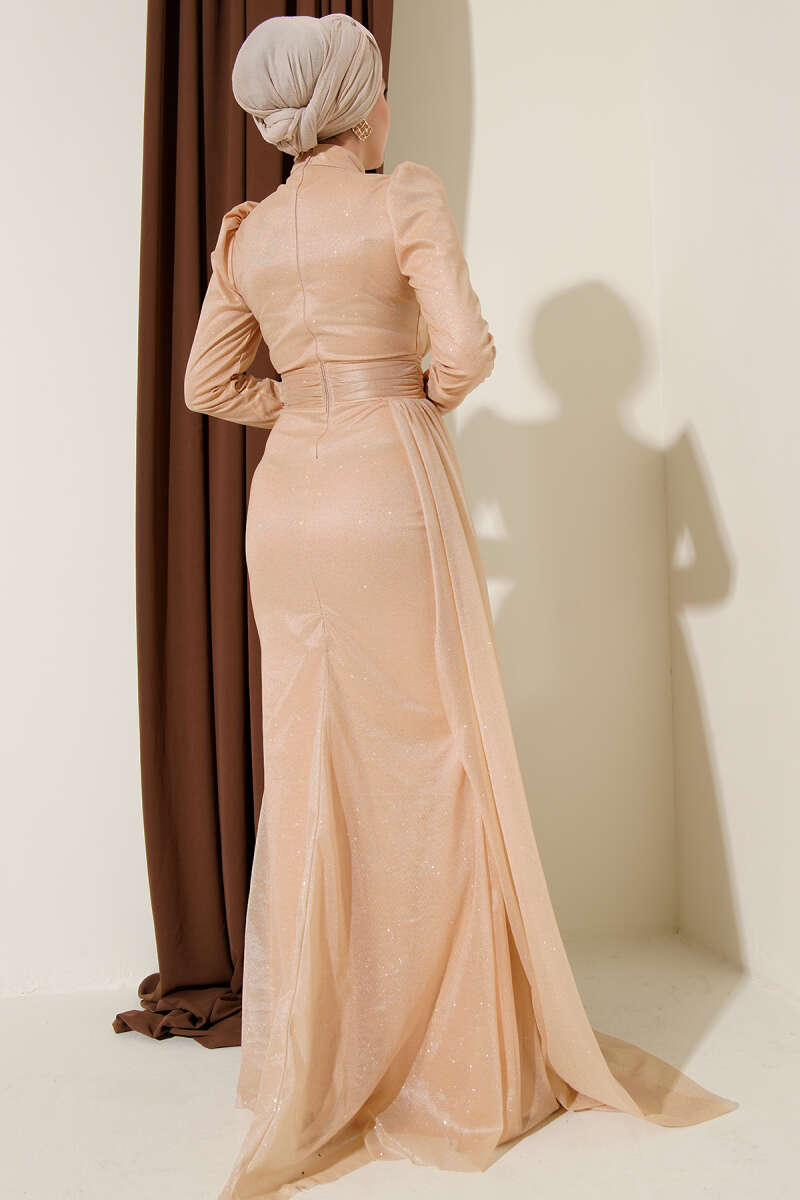 Büzgü Detaylı Simli Abiye Elbise Haki