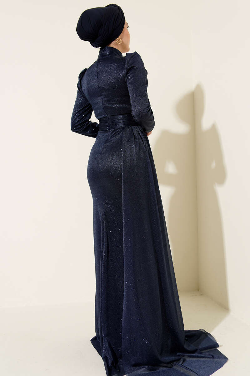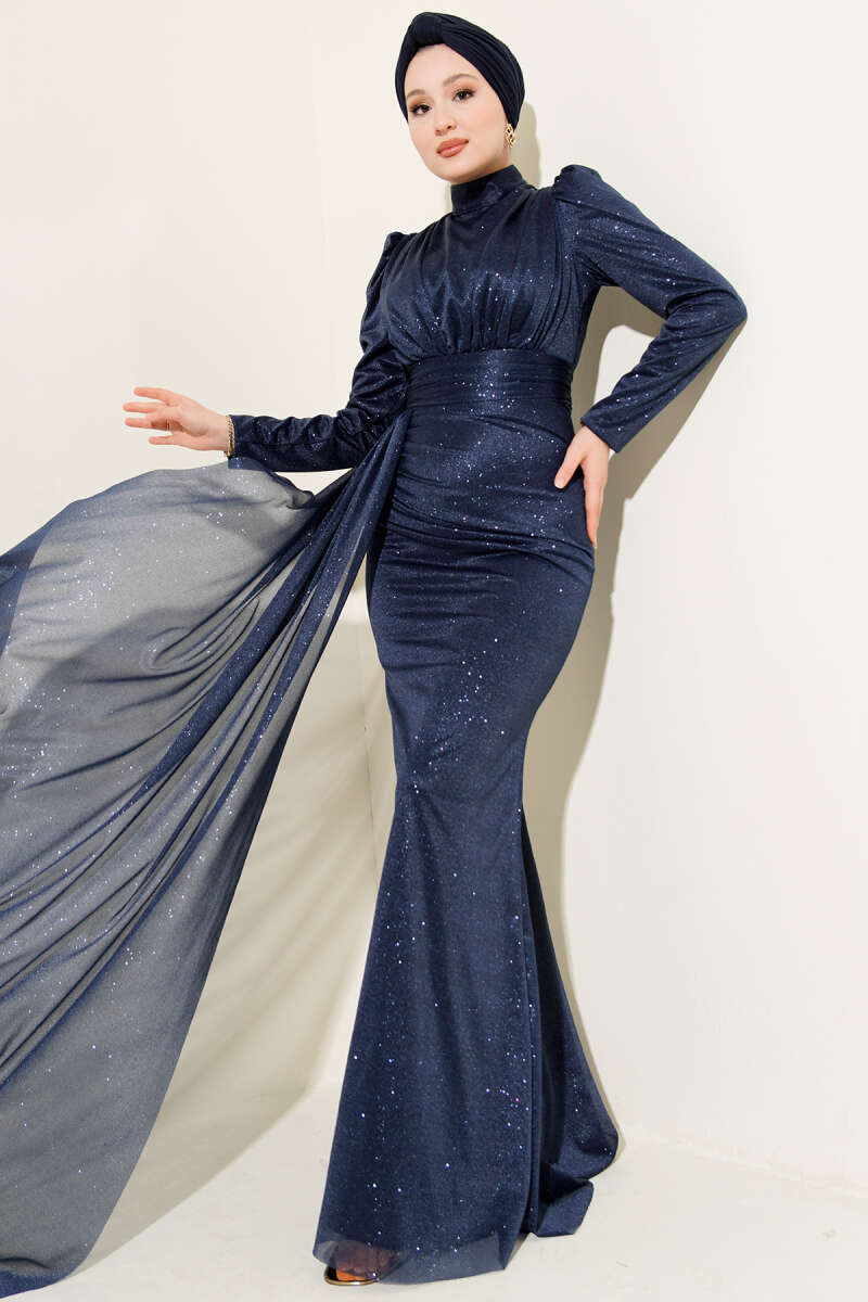 Bel Taşlı Pelerinli Abiye Elbise Lacivert