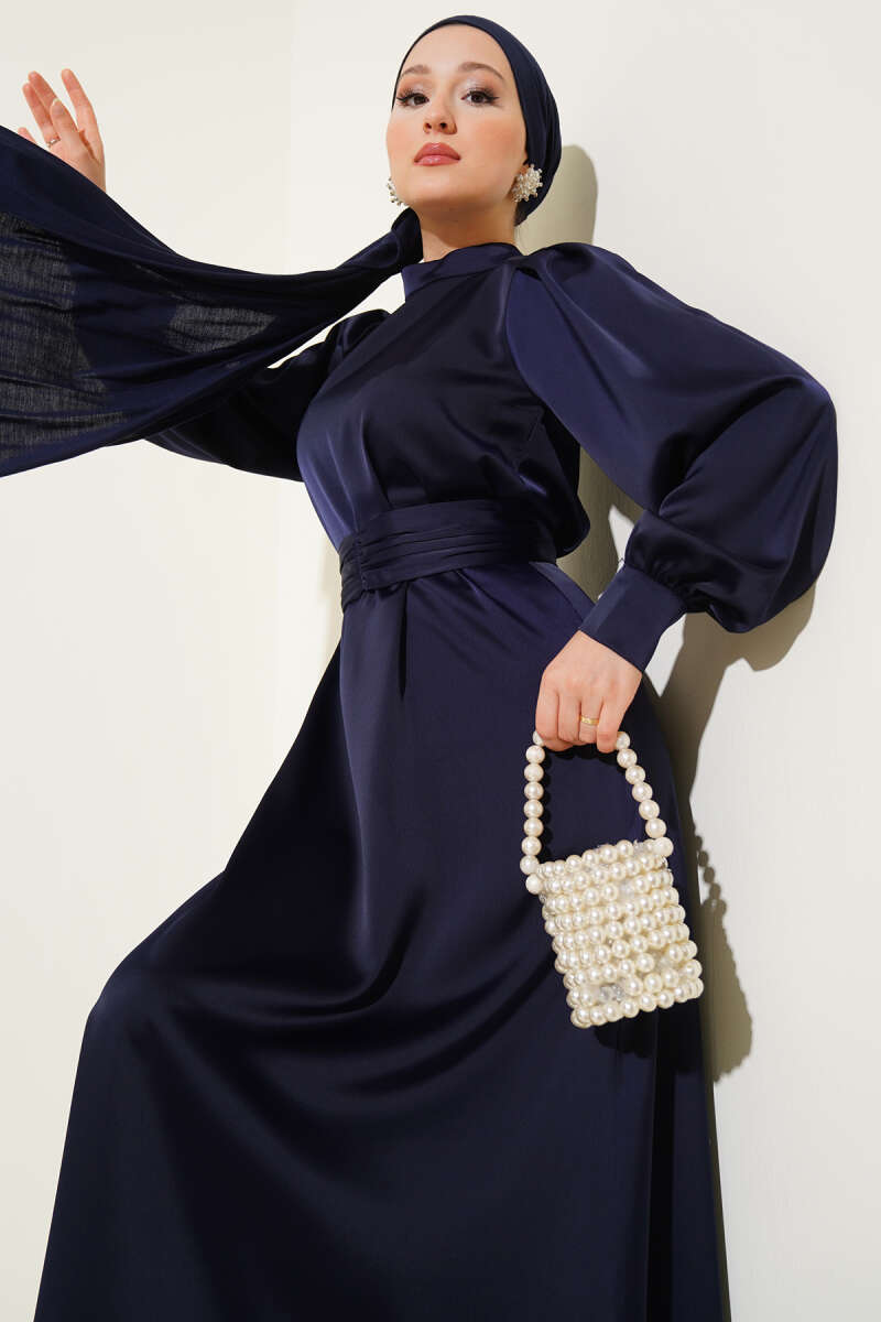 Bel Büzgü Detaylı Abiye Elbise Lacivert