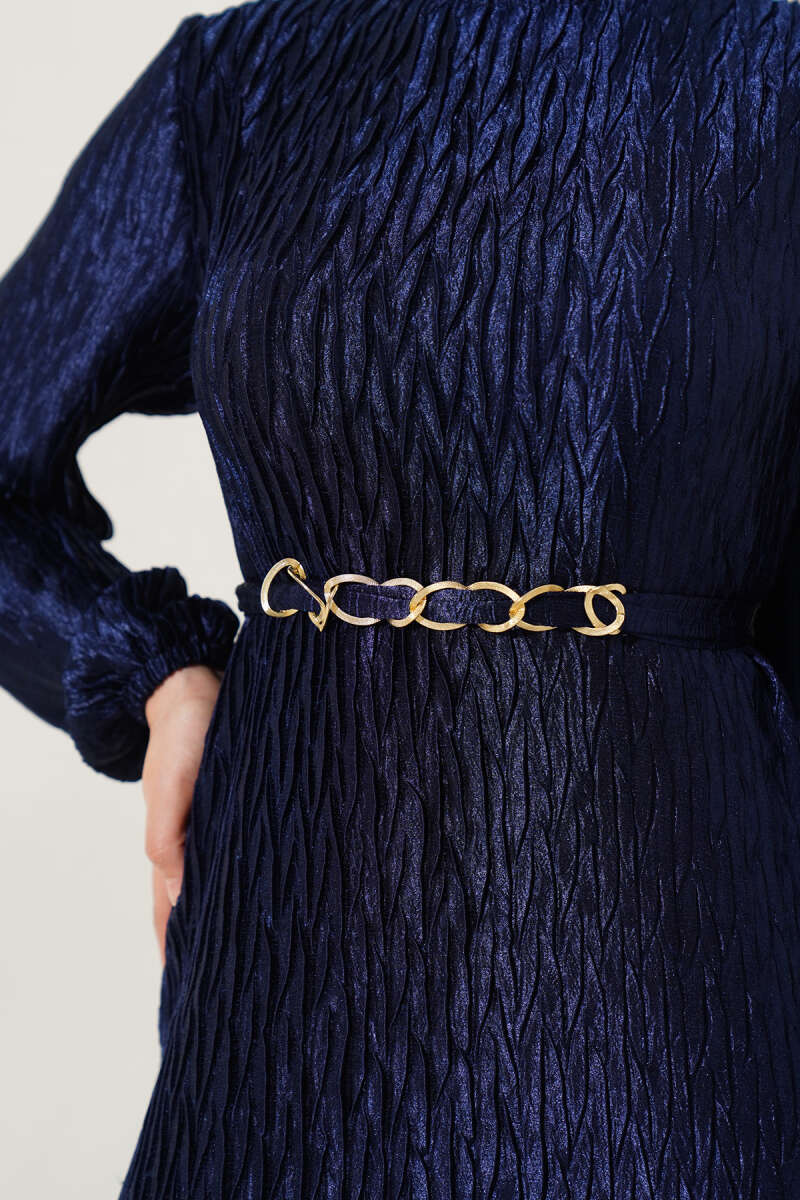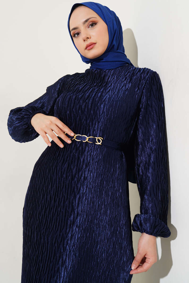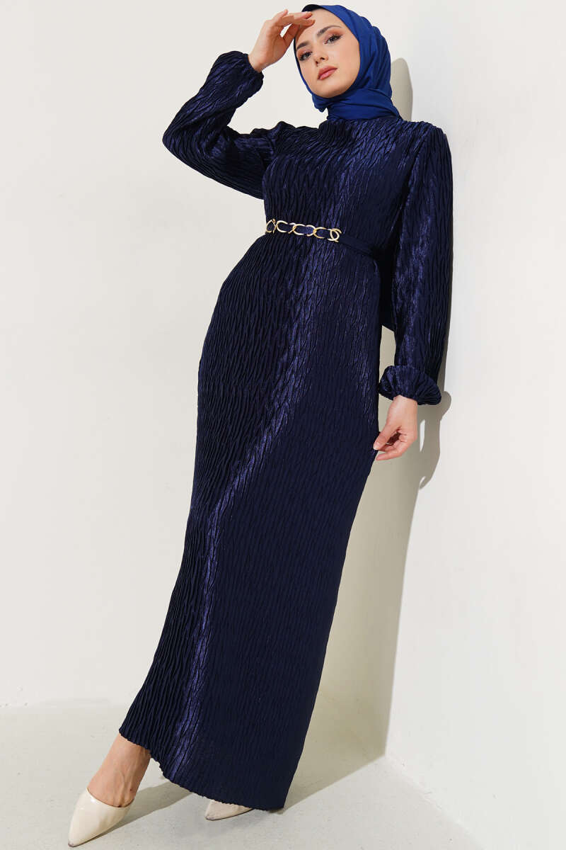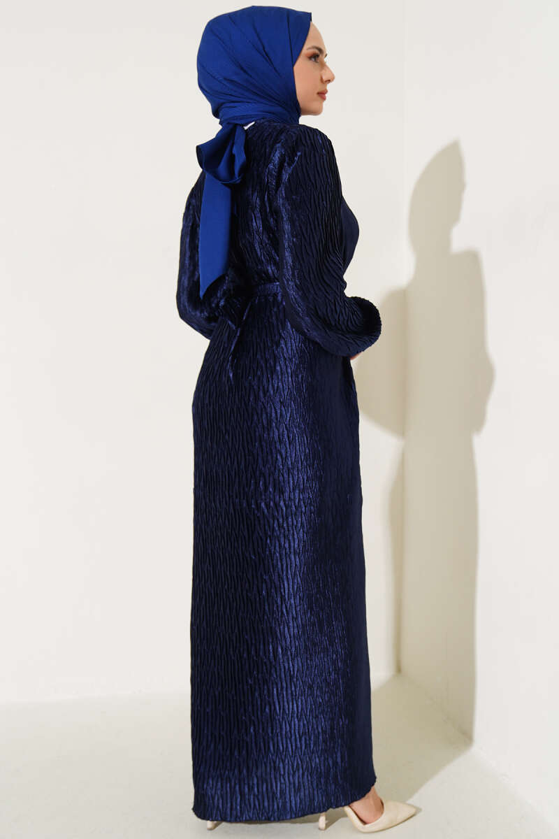 Omuz Pelerinli Taş Detaylı Abiye Elbise Lacivert
