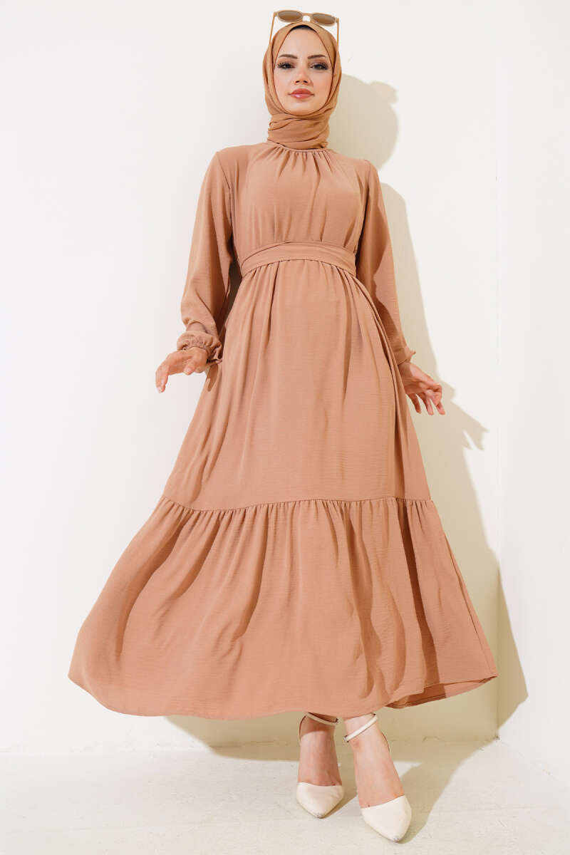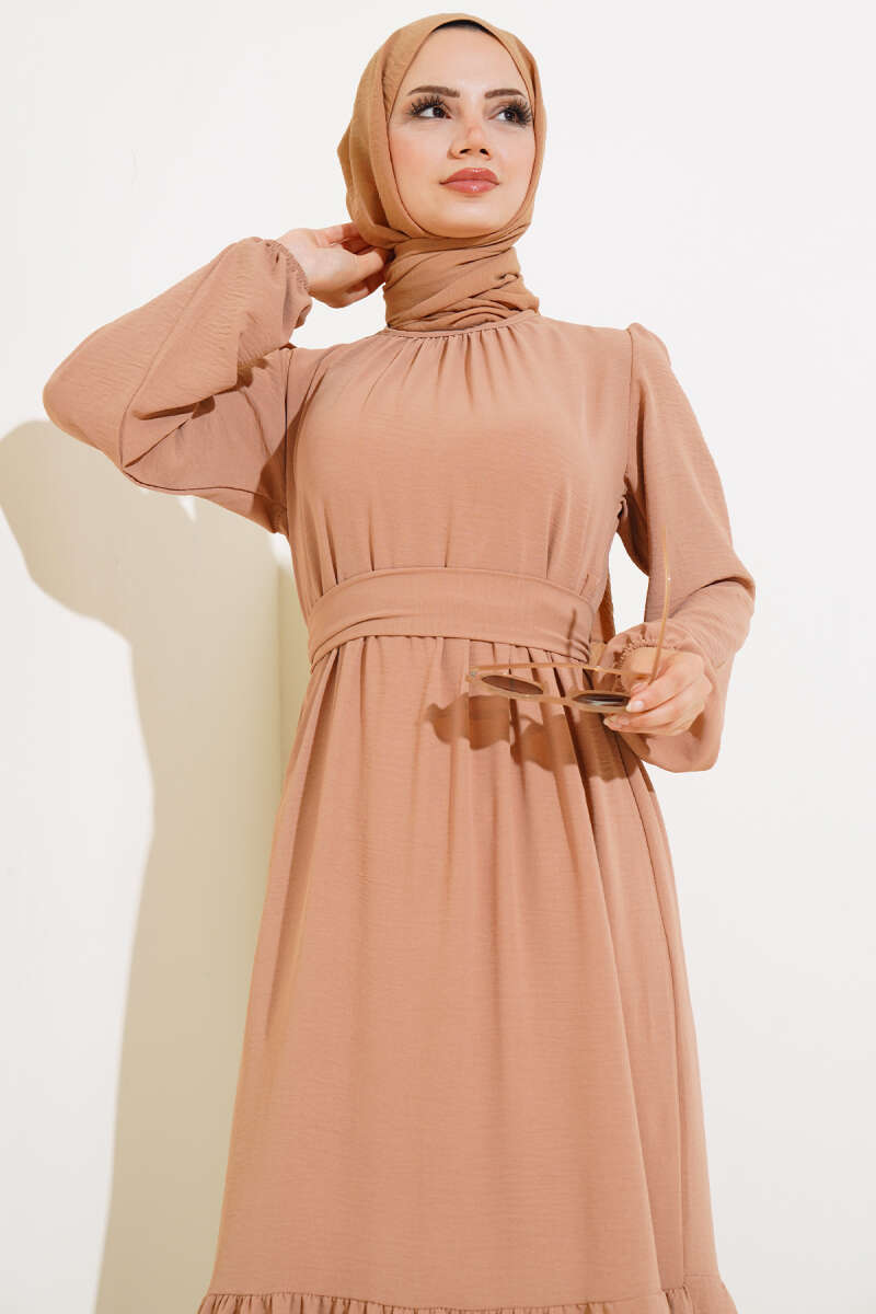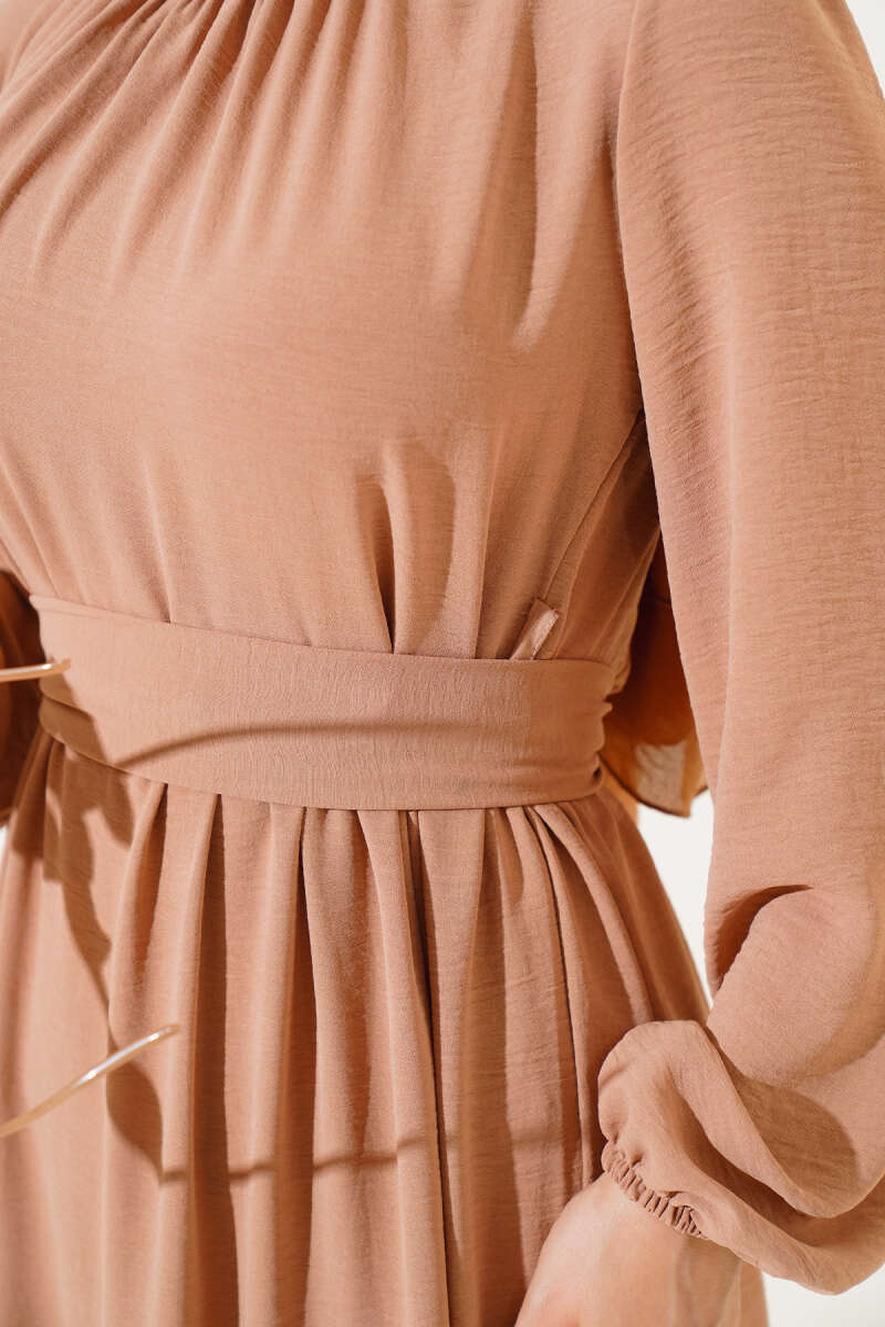 Scuba Pens Detaylı Kemerli Elbise Kahve