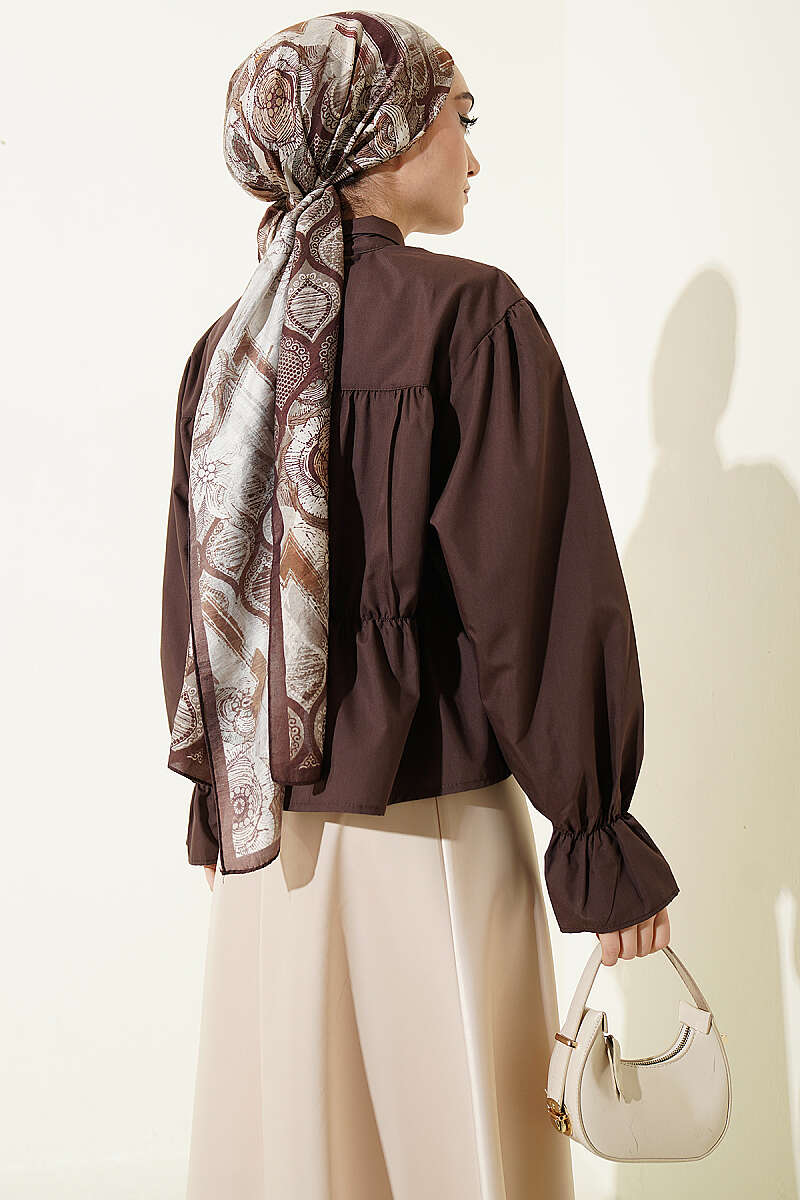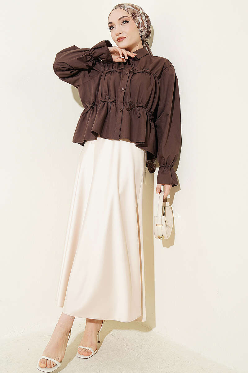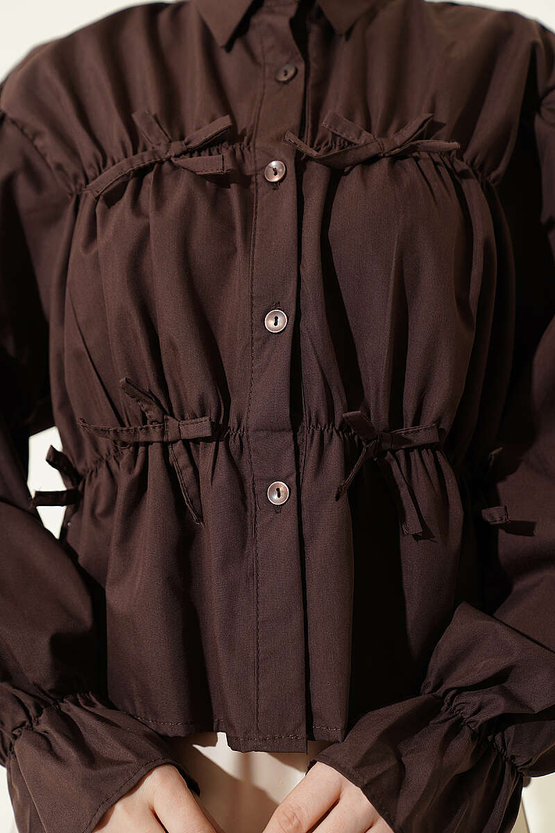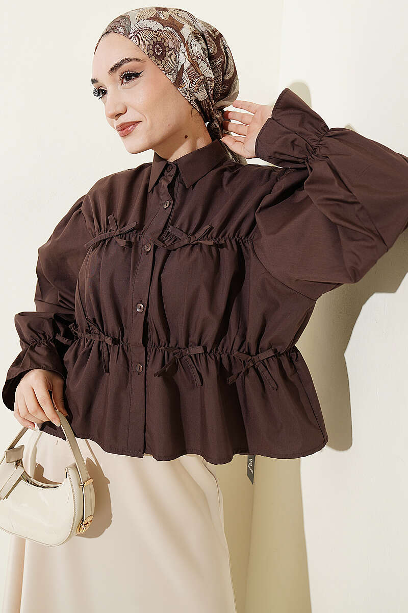 Büzgülü Fiyonklu Kısa Gömlek Kahve